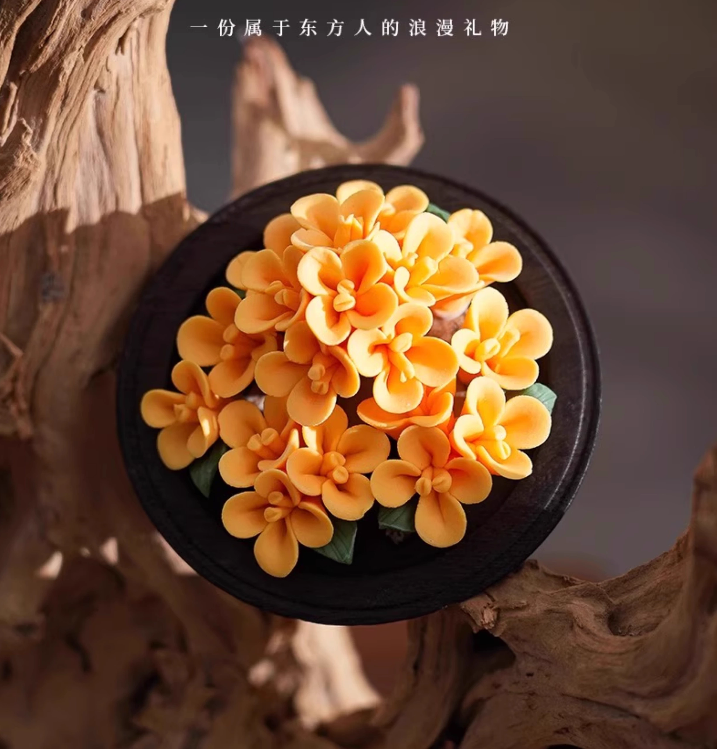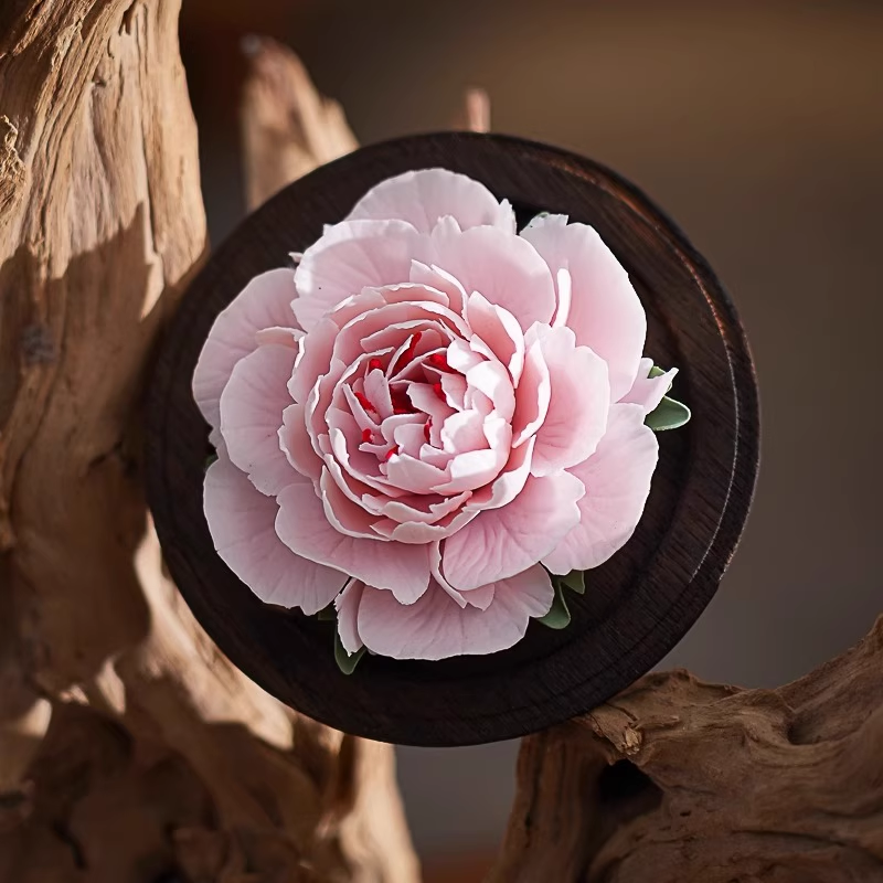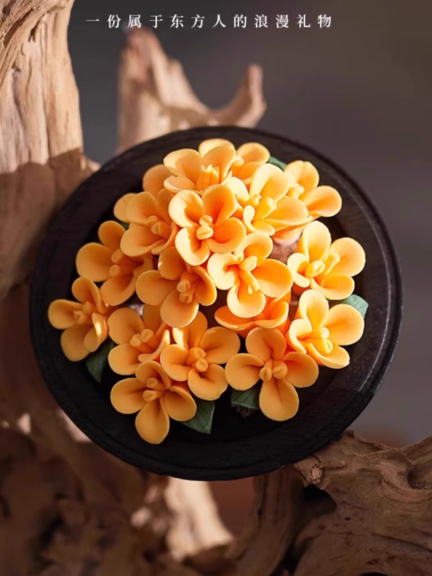 Each porcelain flower is meticulously handcrafted through a multi-layer color blending process known as nian se (hand-color kneading).