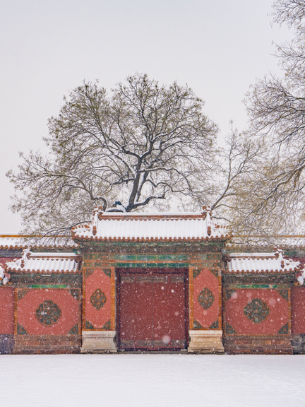 The majestic architecture of the Forbidden City is blanketed in snow.