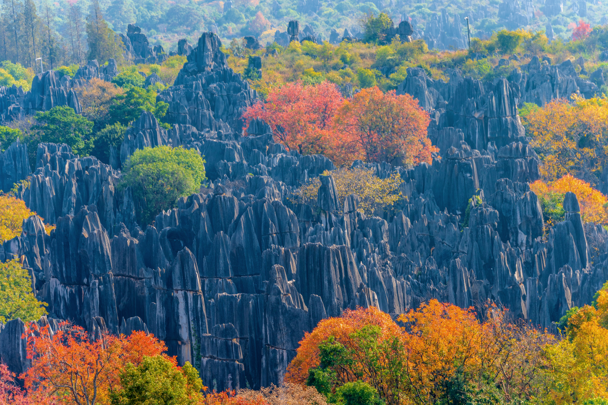 The region includes several scenic zones, such as the Shilin (Stone Forest) Scenic Area, Naigu Stone Forest, Dadieshui Waterfall, Changhu Lake, and Guishan National Forest Park. At its core lies the Shilin Scenic Area—a quintessential example of sword-like karst topography formed in pure limestone. Its five sub-areas—Greater Stone Forest, Lesser Stone Forest, Bushao Mountain, Liziyuanqing, and Wannian Lingzhi—feature a striking variety of stone peaks resembling swords, pillars, towers, mushrooms, balanced rocks, and other imaginative shapes.