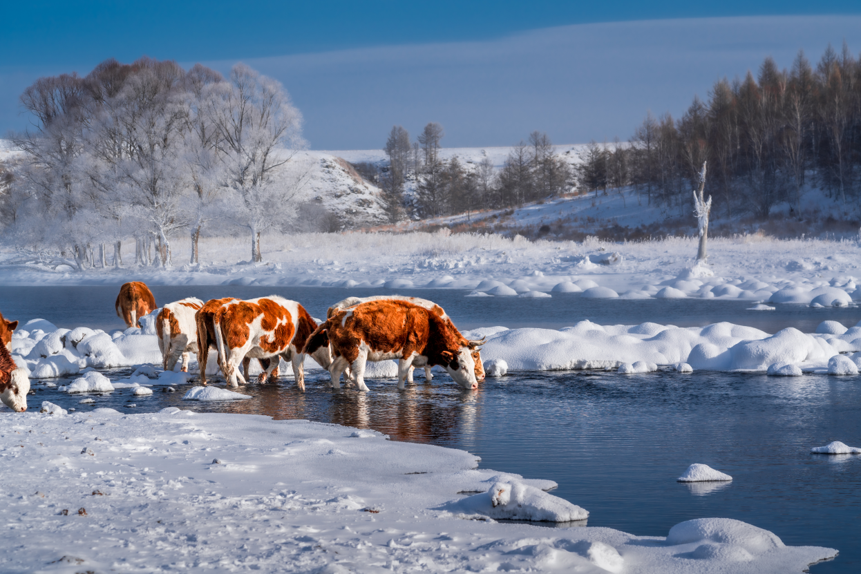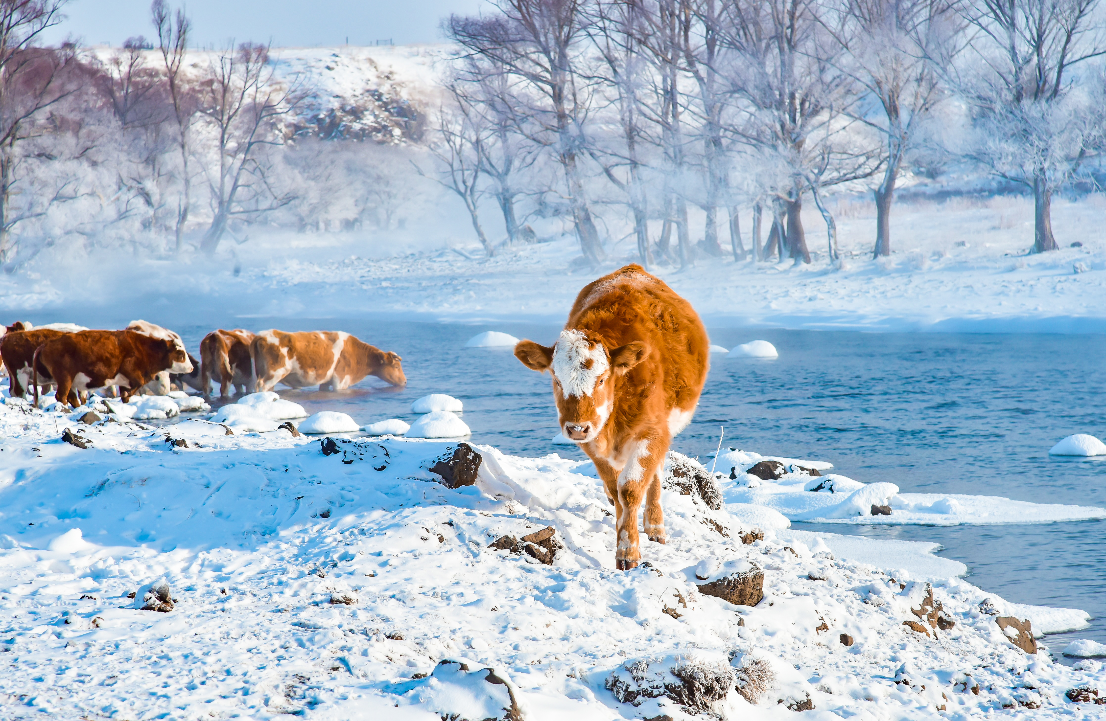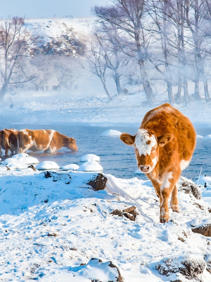 In deep winter, the warm river water rises in mist, and riverside trees are coated in crystalline frost, their icy branches gleaming like jade in sunlight. Lush aquatic plants thrive in the river, and each morning local herders bring their cattle and sheep here to drink and graze.