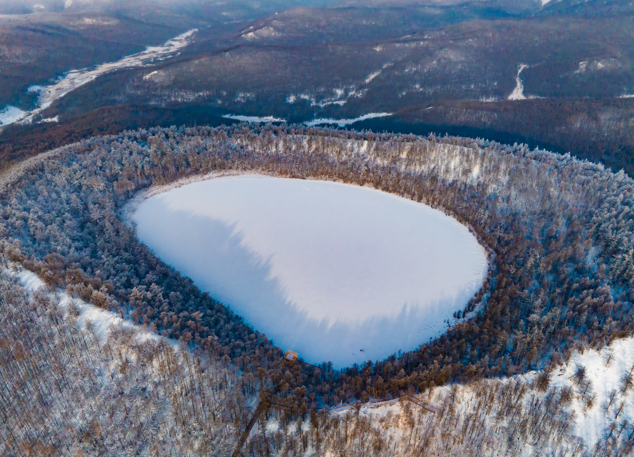 Arxan's unique geology and topography create layered, panoramic scenery. When the first snow falls, the golden forests are draped in thick white. As the sun sets, the lingering sunglow lengthens the trees' shadows, casting a second golden forest across the snowy ground. Across a seven-month snow season, Arxan becomes a dreamlike kingdom of ice and snow.