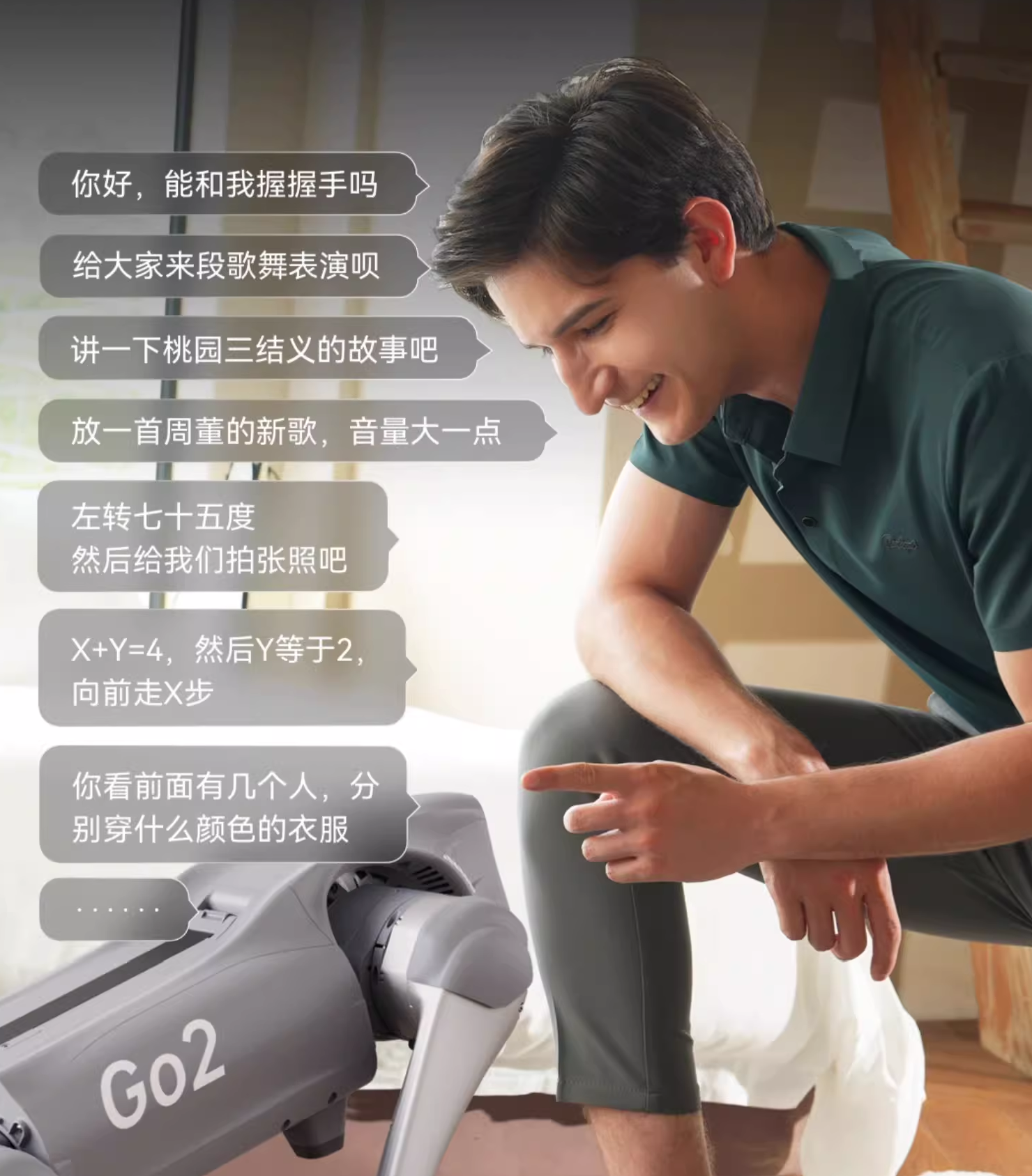 Artificial intelligence + robotics: empowered by a GPT large model, the robot dog serves as an encyclopedia capable of chatting in both Chinese and English, with knowledge spanning humanities, history, math riddles, and general Q&A. By combining AI with hardware, the robot dog can interact with humans through actions such as New Year greetings, handshakes, music playback, and photo-taking.