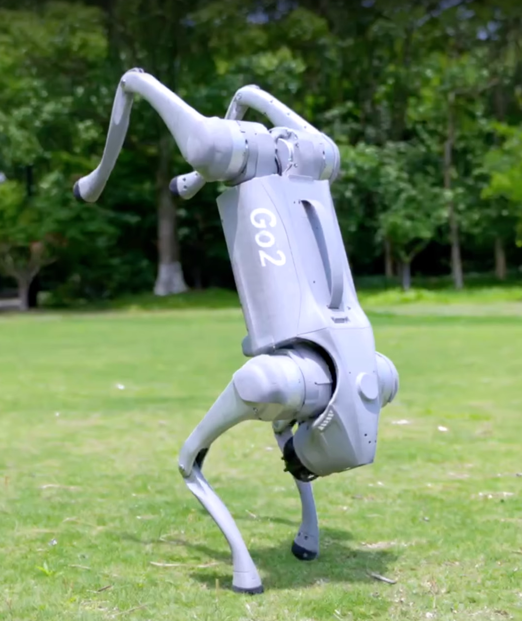 Through extensive AI simulation training, the Go2 robot dog has mastered advanced gaits such as handstand walking, adaptive rollover recovery, and obstacle crossing and climbing, while maintaining excellent flexibility and stability.