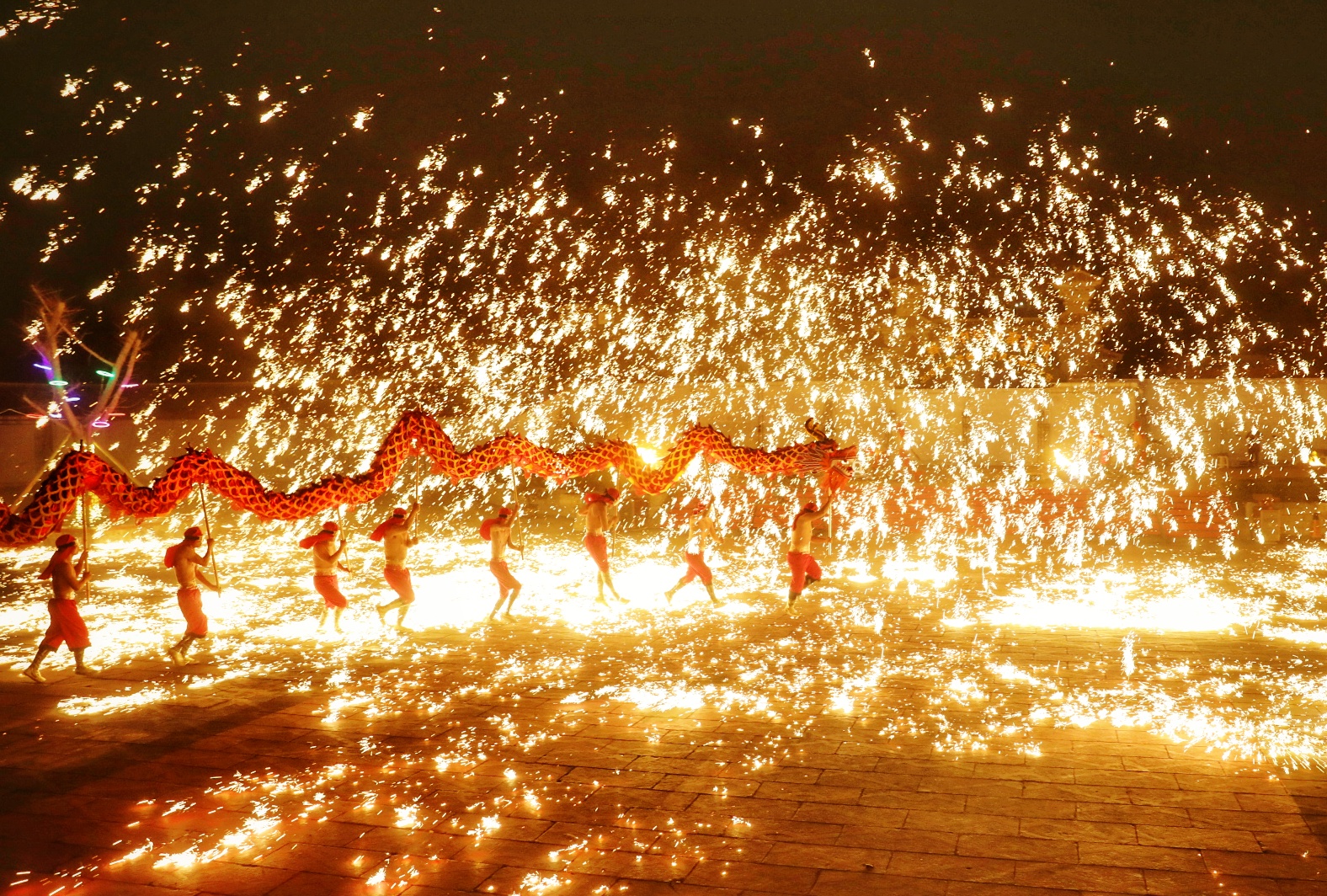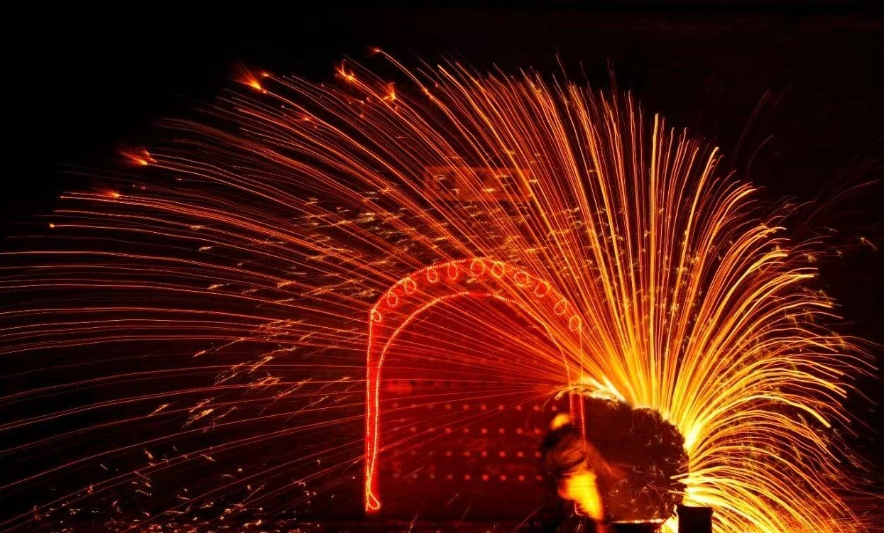 Yuxian County, Heibei is one of the birthplaces of dashuhua (lit., "striking tree flowers"), a celebrated variation of the traditional datiehua performance. During this spectacular folk art show, performers splash molten iron onto the ancient wall, creating a breathtaking shower of sparks that strikingly resemble a towering tree, hence the name.
