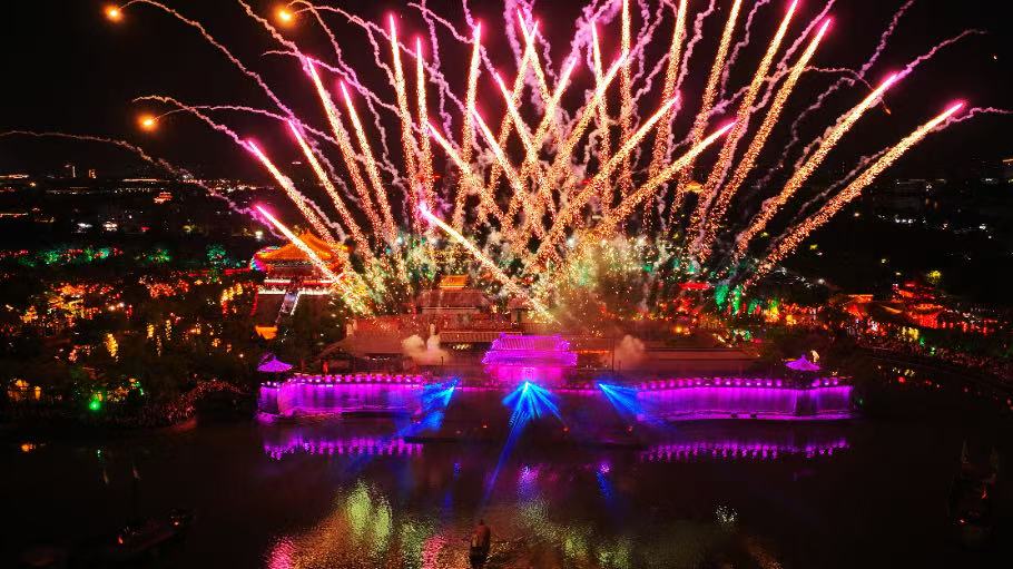 Visitors can witness captivating datiehua performances, a stunning blend of historical storytelling and visual spectacle. This act serves as the climactic finale of the large-size outdoor scene show on water, Song Dynasty Dongjing Dreaming. Set against the backdrop of the famous painting by Zhang Zeduan of the Northern Song Dynasty, Along the River During the Qingming Festival, it vividly recreates the bustling splendor of the Song capital at night, with a dazzling display of lights reminiscent of the city's "fire-trees and silver flowers that never sleep."
