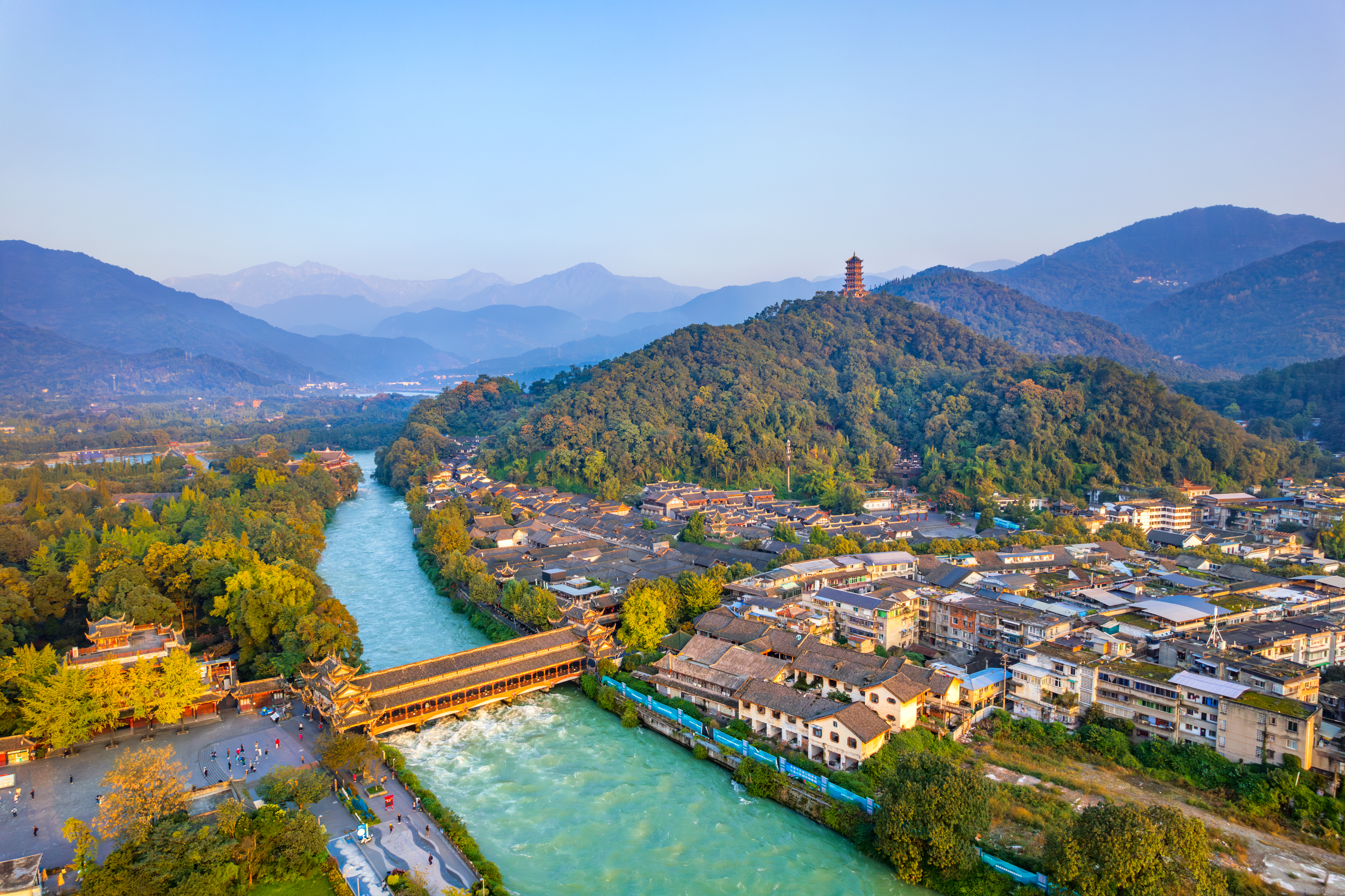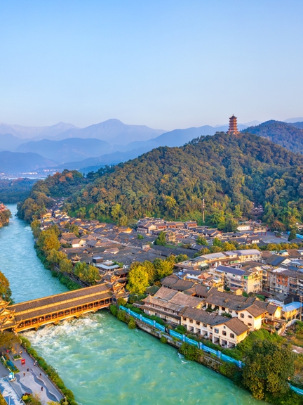 Answer: The Dujiangyan system consists of the headworks (the Fish Mouth Levee, Flying Sand Weir, and Bottle-Neck Channel) and an extensive irrigation network. The Fish Mouth Levee divides the Min River into an outer and an inner channel, achieving the principle of "diverting 60% of the flow for irrigation and 40% for flood discharge to balance water in both floods and droughts". In dry seasons, 60% of the river’s flow is directed into the inner channel for irrigation, while during floods, 60% is diverted to the outer channel to prevent flooding. This remarkable design showcases the ancient Chinese wisdom of dam-free, eco-friendly water management.