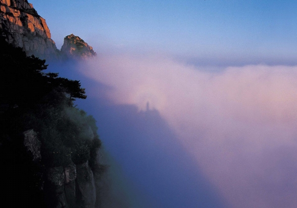 Known as Buddha light of Mount Tai, this optical phenomenon is caused by light diffraction and derives its name from its resemblance to the halo surrounding a Buddha statue. It mostly occurs on Mount Tai between June and August, under partly cloudy and foggy conditions when the sun shines obliquely.