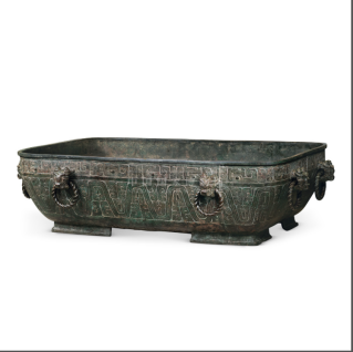 The "Guo JiZi Bai" Bronze Pan is rectangular in shape, with a straight mouth and squared lip. The walls slope inward toward the base. Each of the four sides is fitted with a pair of animal-head handles holding rings. It is the largest water vessel from the Shang and Zhou periods discovered to date.