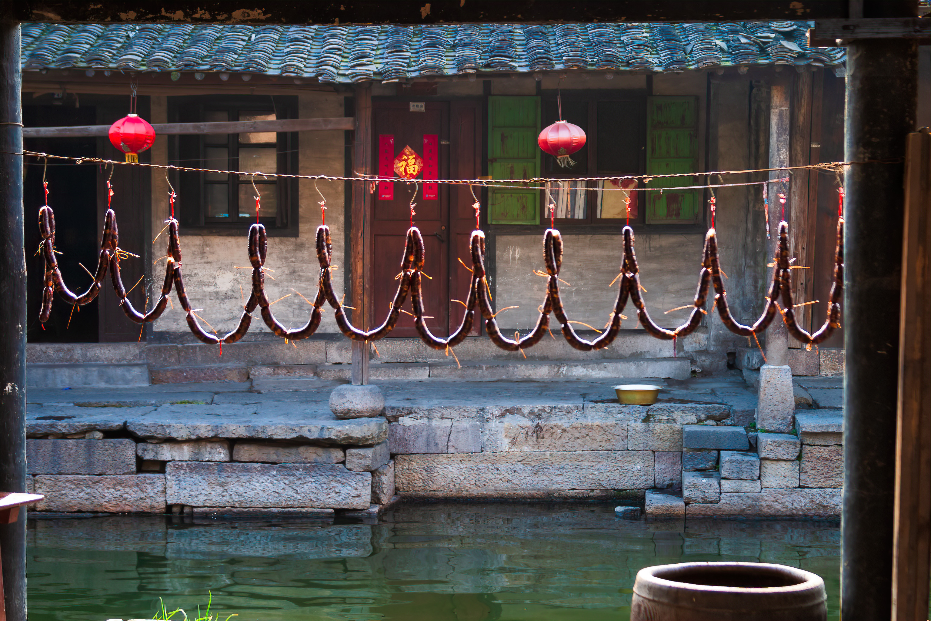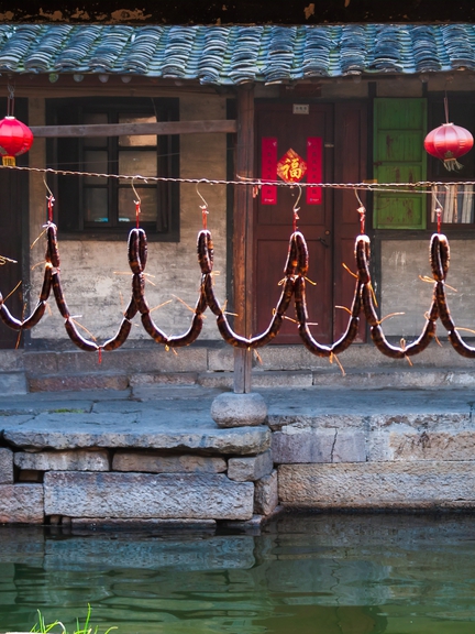 Anchang Preserved Sausage is a traditional specialty food from Anchang Town in Shaoxing, Zhejiang Province. It is made with lean hind-leg pork and pork fat, seasoned with Shaoxing wine and soy sauce, then hand-stuffed and air-dried. The result is a sausage known for its rich soy aroma and balanced sweetness. In 2023, the Anchang Preserved Sausage–making technique was included in the sixth batch of representative items of Zhejiang Provincial Intangible Cultural Heritage.
