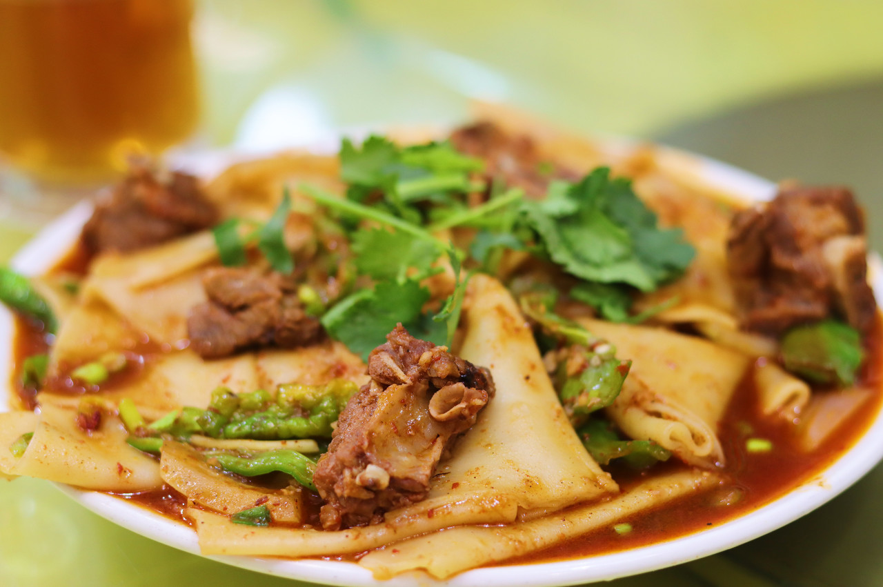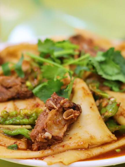 Stewed lamb with flatbread features lamb braised until tender and falling off the bone, paired with thin, wide noodles that soak up the broth. Soft yet springy, each bite releases deep, rich flavors that warm you from the inside out.