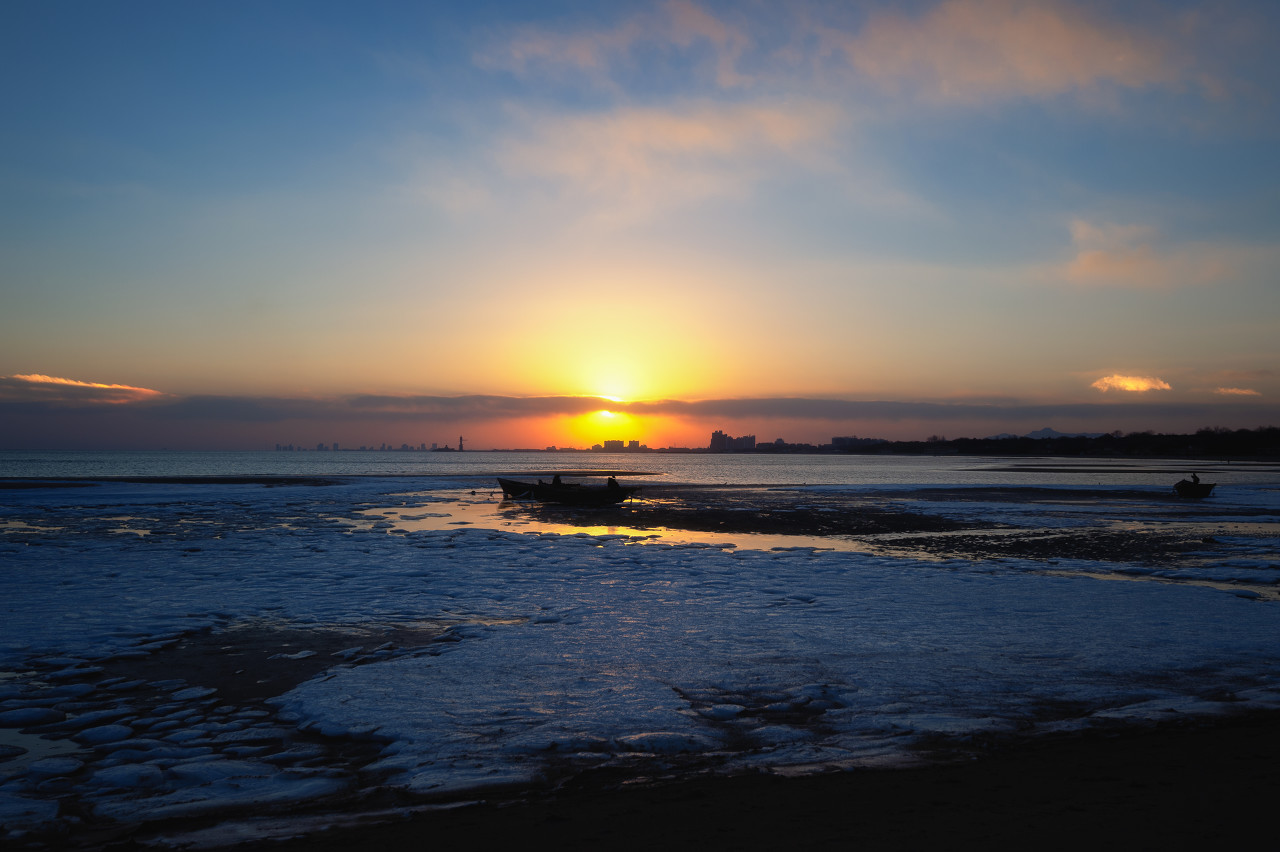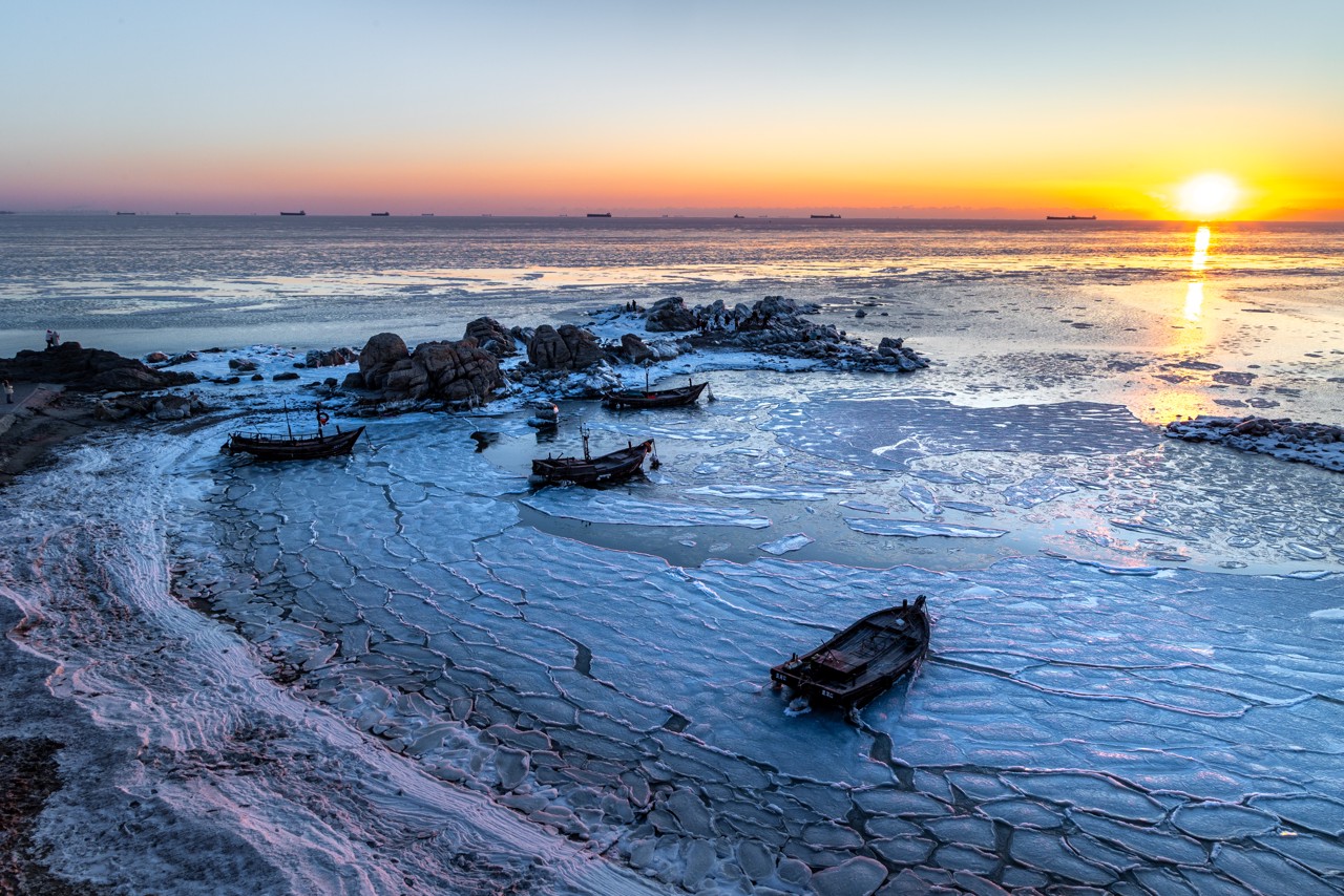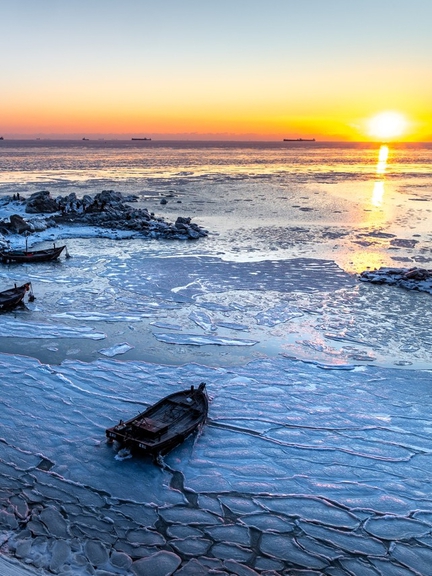 A recent cold wave has left ice along Qinhuangdao's coast: a layer of crystal‑clear frost flowers drifts across the sea. When the first rays of morning sun strike the ice, the vast ocean takes on the look of a dreamlike oil painting. The meeting of ice, snow, and sea creates a winter marvel—an "Icy Sea Sunrise."