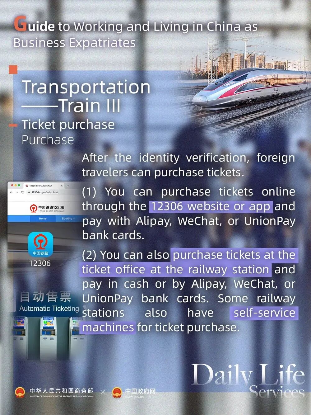 Foreign travelers can usetheir Foreign Permanent Resident ID Cards and passports to purchase tickets through the 12306 website, 12306 APP, or booking hotline.