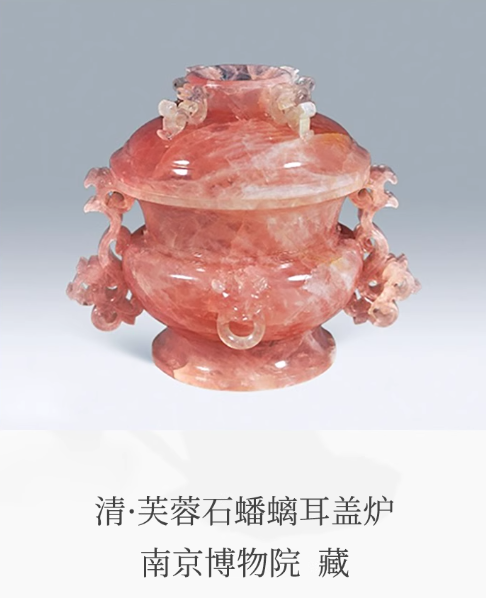 The Qianlong-era Hibiscus Stone with Coiled Dragon Eared Lid Furnace is an artifact from the Qing dynasty, now housed in the Nanjing Museum. Due to its rare material, archaic form, and soft and elegant luster, it is regarded as a representative piece reflecting the imperial court aesthetic of the Qianlong period.