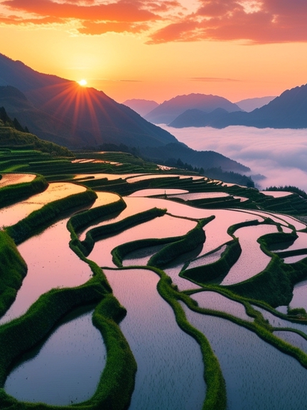 The Yunhe Terraced Fields Scenic Area is located in Chongtou Town, Yunhe County, Lishui City. Spanning high mountains, hills, and valleys, it is the largest terraced field complex in eastern China and is often praised as "China’s Most Beautiful Terraced Fields". The area boasts stunning landscapes including layered terraces, seas of clouds, traditional villages, bamboo forests, streams, waterfalls, and hard rime.