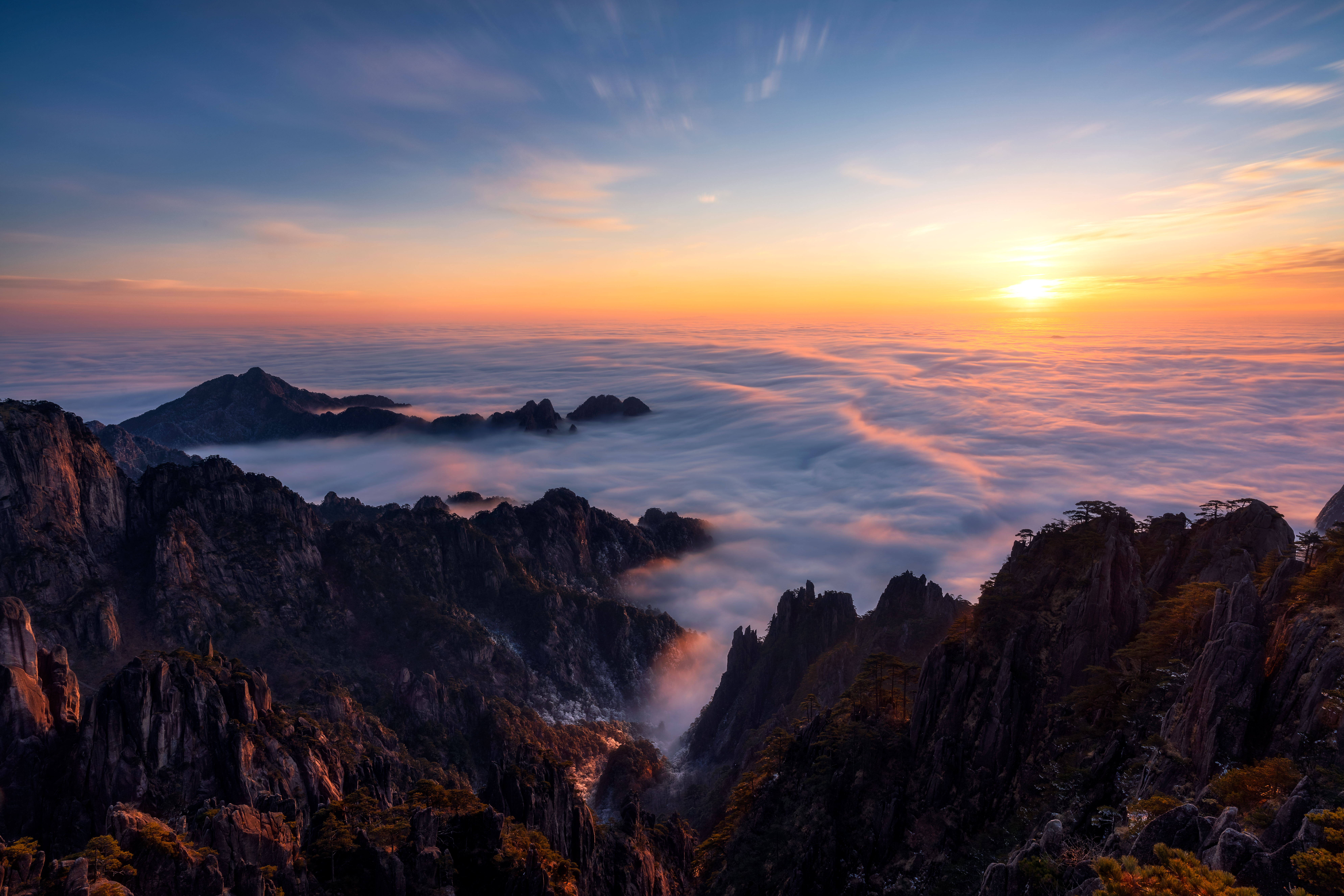 Mount Huangshan, located in Huangshan City, Anhui Province, is celebrated worldwide for its "Five Natural Wonders": fantastically shaped pine trees, dramatic rock formations, vast seas of clouds, natural hot springs, and enchanting winter snow. Beyond its natural beauty, Huangshan is also revered for its profound cultural legacy, encompassing historic relics, traditional painting and calligraphy, classical literature, folklore, and renowned historical figures. Long praised as "the Most Fantastic Mountain Under Heaven", "a painting created by nature", and "an ocean of pines and clouds", Huangshan offers an unforgettable experience. Watching the sunrise from its lofty peaks, as clouds roll beneath your feet, delivers a moment of deep spiritual awe and lasting inspiration.