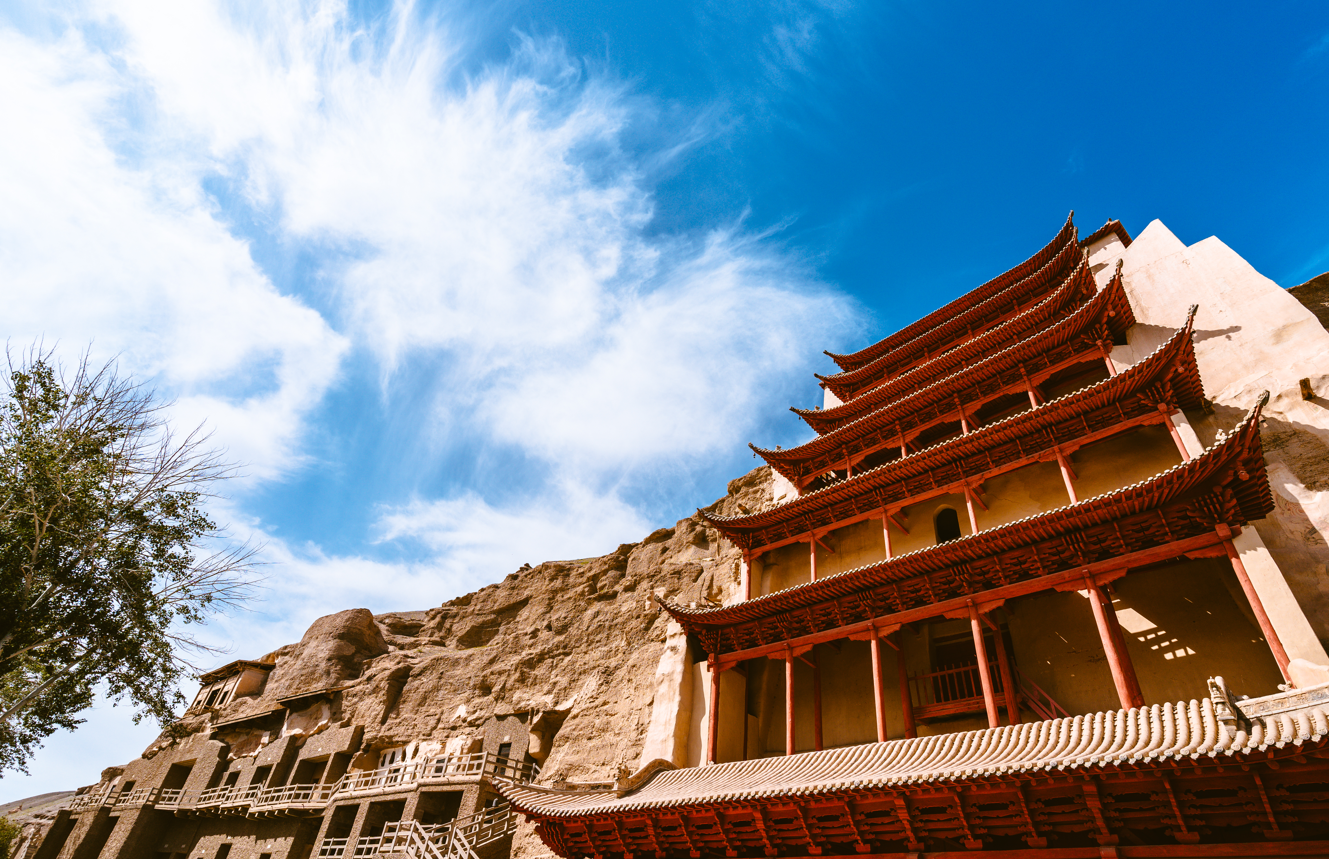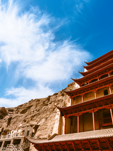 Flying Apsaras (Feitian) are celestial beings who glide through the heavens of Buddhist realms, also known as Gandharvas and Kinnaras. In the Northern Liang period, they were often depicted as male. By the Tang Dynasty, however, most were portrayed as graceful, richly dressed female figures with flowing postures.