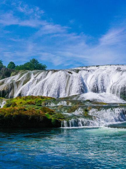 The Huangguoshu Waterfall stands 77.8 meters high and 101 meters wide. Torrents of water plunge over 70 meters from the cliff into the Xiniu(Rhino) Pool, creating a thunderous roar that reverberates through the valley and showcasing a spectacular natural force. Visitors can walk through the Water-Curtain Cave to feel the rush of water from behind the fall or gaze up at the cascade from the edge of the Xiniu Pool. When mist fills the air, rainbows often arc across the scene, composing a breathtaking natural panorama.
