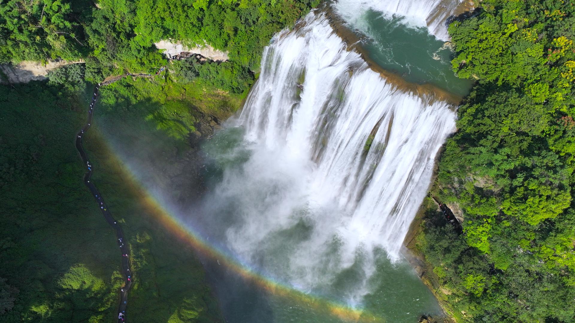 Doupotang is the widest waterfall in the Huangguoshu cluster, with a crest spanning 105 meters. It is also the filming location for the concluding scenes of the 1986 adaptation of Journey to the West, where the classic shot of Tang Sanzang and his disciples leading their horse across the water was filmed.