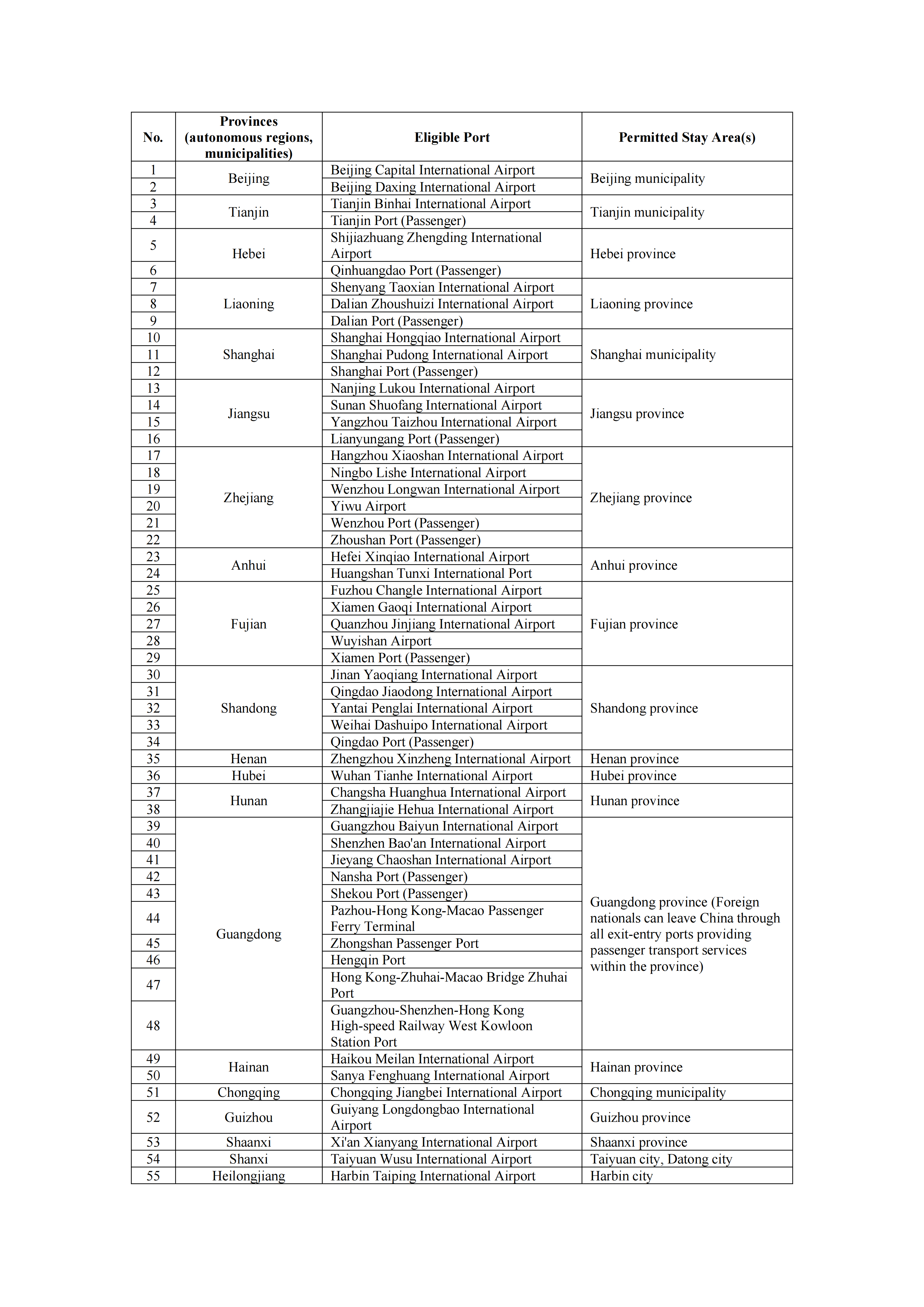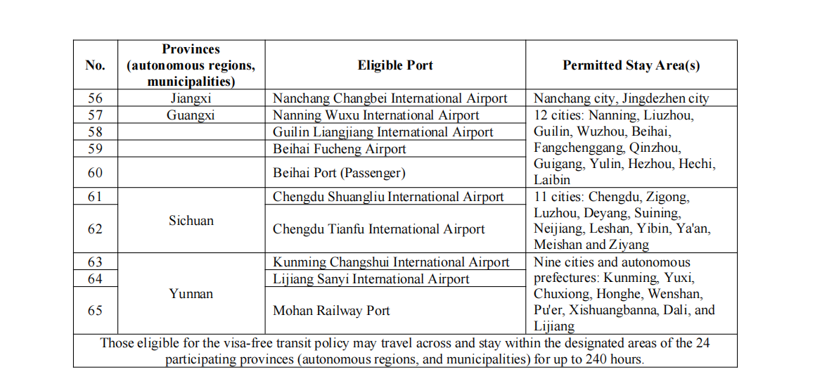 (II) List of Ports and Allowed Areas for Visa-Free Transit Travelers under the 240-Hour Visa-Free Transit Policy