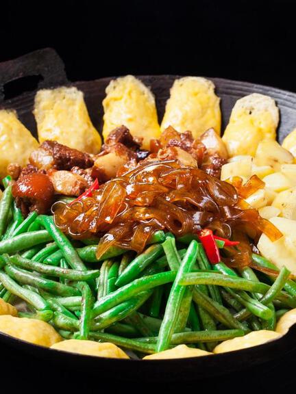 Stewed chicken with mushrooms, Korean ginseng chicken, braised pig face, iron pot stewed goose, iron pot stew, Jixi knife-cut noodles, Mishan grilled cold noodles, pig roast, radish stewed lamb, sticky rice bean buns, Hegang grilled skewers, and DumplingXi