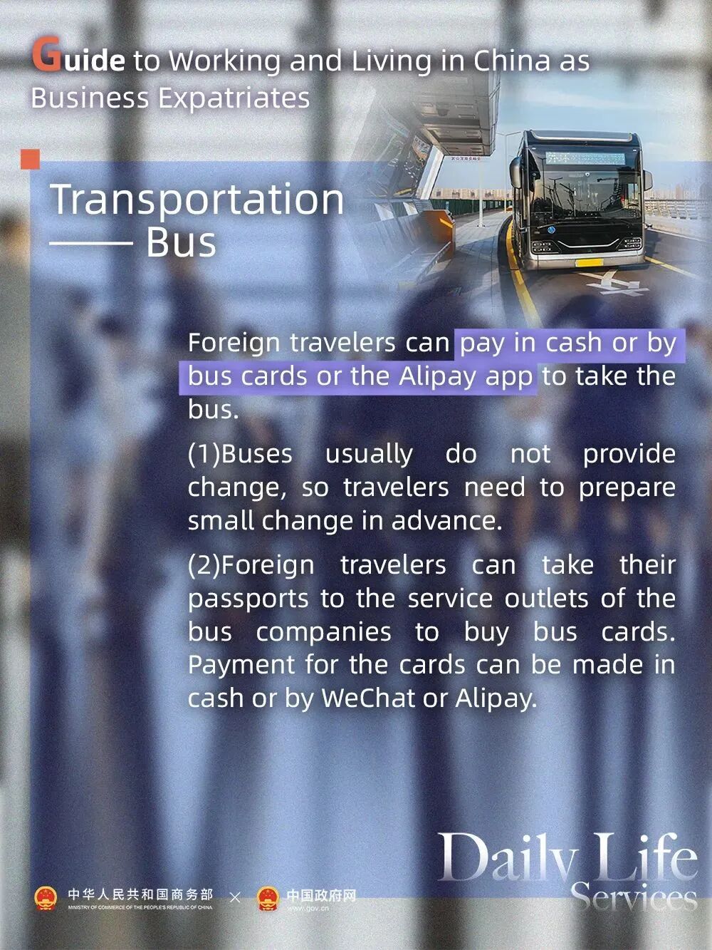 Foreign travelers can pay in cash or by bus cards or the Alipay app to take the bus: