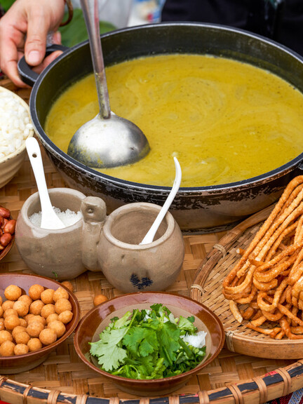 The soaked tea leaves are first placed in the iron pan and lightly stir-fried to evaporate excess moisture. Ginger, garlic, peanuts, and oil, each previously lightly smashed, are then added and fried together. Using the oil-tea pestle, the cook pounds out the juices of the ginger and garlic, crushes the peanuts, and grinds the tea leaves into fine shreds. Once the tea leaves are fully pounded, boiling water is poured into the pan, along with a pinch of salt. As the ingredients are blended with the hot water, the mixture assumes a yellowish-green hue. The tea strainer is then set over a teapot, filtering out the solids and leaving behind a clear, bright Oil Tea.