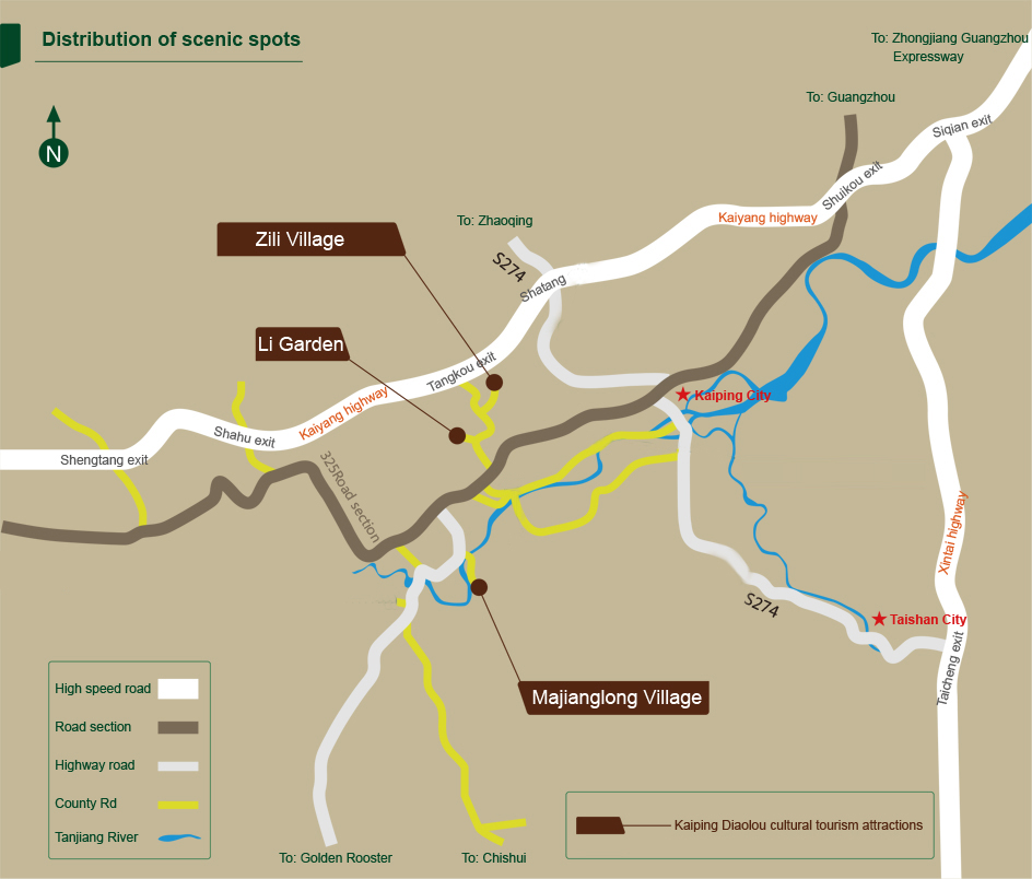 Located southeast of Baihe Town in Kaiping City, Majianglong Village contains more than ten distinctive and well-preserved diaolou, nestled among dense bamboo groves. These towers historically protected villagers’ lives and property. During three major floods in 1963, 1965, and 1968, floodwaters submerged local homes, and villagers were able to take refuge in the diaolou.