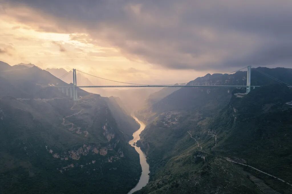 Straddling the border between Guanling and Zhenfeng counties in Guizhou, the Huajiang Grand Canyon Bridge arches over the Huajiang Grand Canyon, dubbed the "Earth's Fissure" by geologists. With its deck soaring 625 meters above the water surface and a main span of 1,420 meters, the bridge currently holds the world records for both height and span.