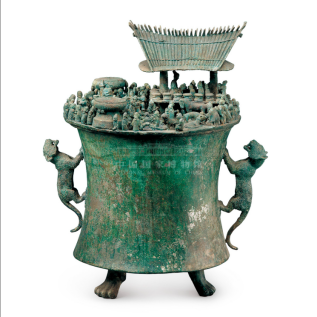 When excavated, this vessel contained more than 300 cowries. Cast on it are 127 three-dimensional human figures in the round (incomplete figures not included), arranged around activities taking place on stilted buildings. The scene depicts the ceremonial proceedings of curse-making and oath-taking, including sacrificial killings conducted by the King of Dian.