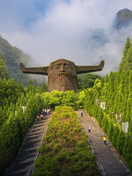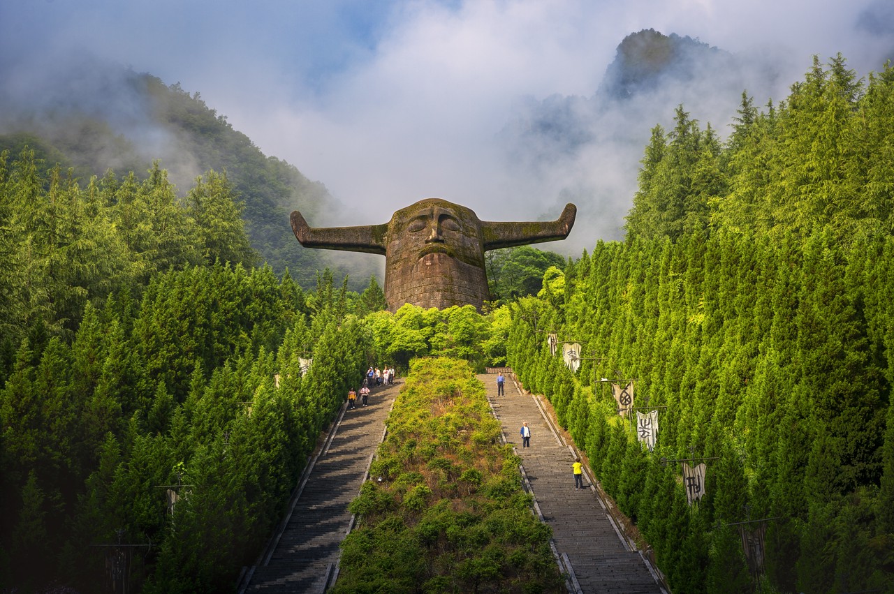 This sacred site honors Yandi (the Yan Emperor), a legendary ancestor of the Chinese people. Towering ancient trees create a serene atmosphere, while an imposing statue of a bull‑headed human figure and stones representing the five elements and colors symbolize the harmonious coexistence of all things.