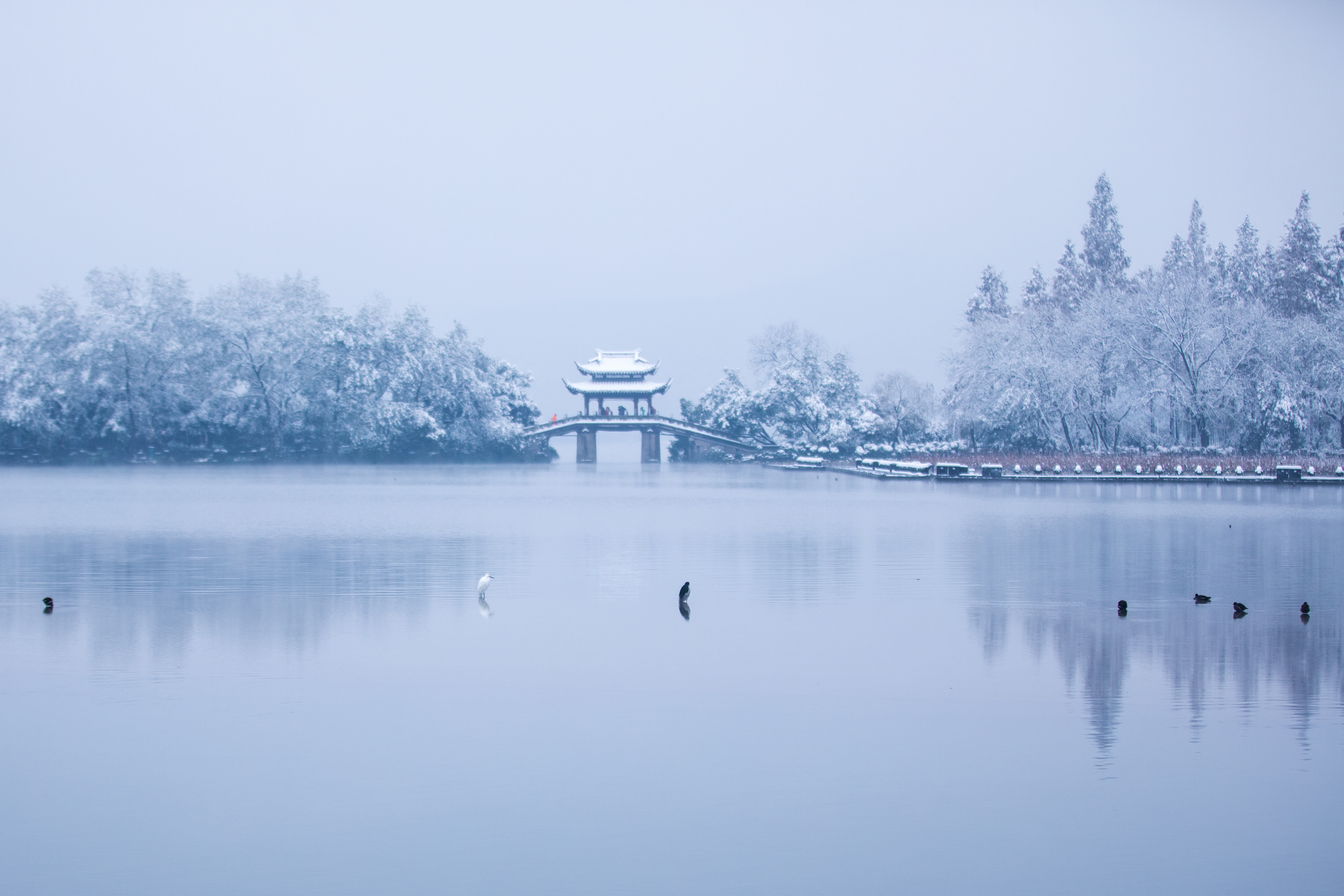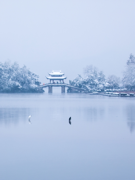 Delicate snowflakes fall lightly on bridges and the lake surface.
