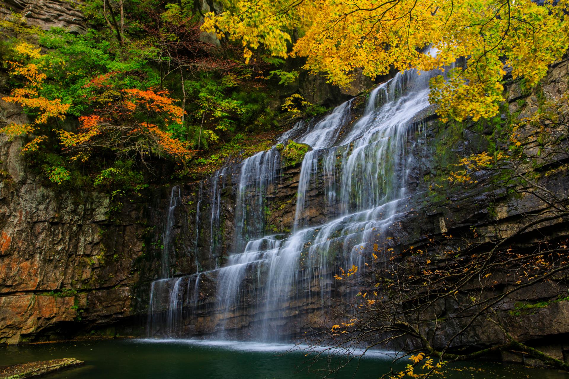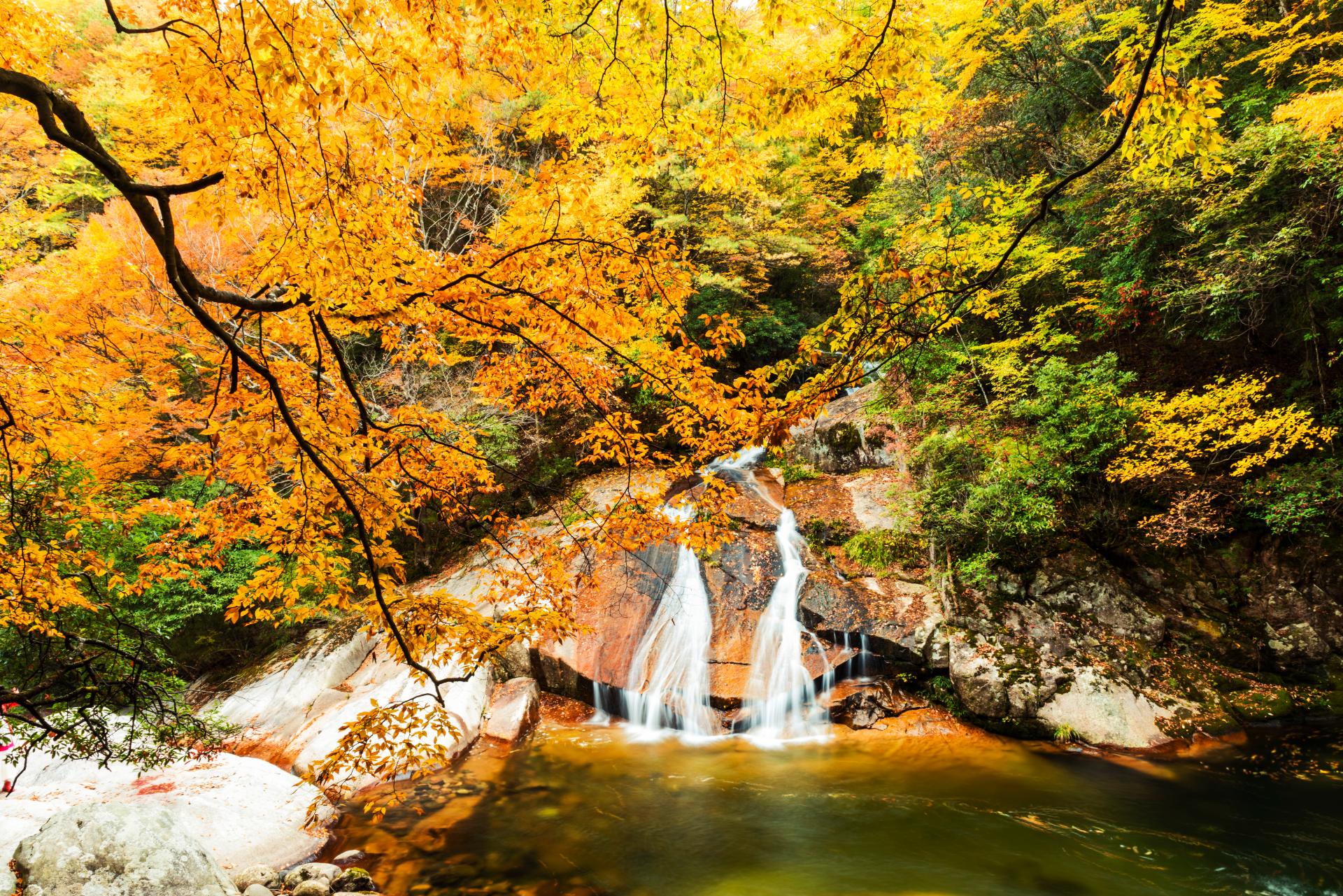 Eighteen Moon Lake: A series of 18jade-green poolsarelinked by streams and cascading waterfalls, creating a stunning contrast with surrounding red leaves in early November.