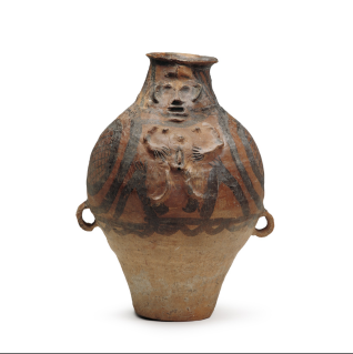 This painted pottery ewer combines relief sculpture and painting into a single work and is hailed as a rare artistic treasure. The distinctive decorative motifs indicate that it was not a utilitarian vessel but rather a ritual or funerary item made specifically for burial. It is generally believed to represent an androgynous figure combining both male and female attributes, a form of dual-gender worship associated with ancient shamanistic beliefs.