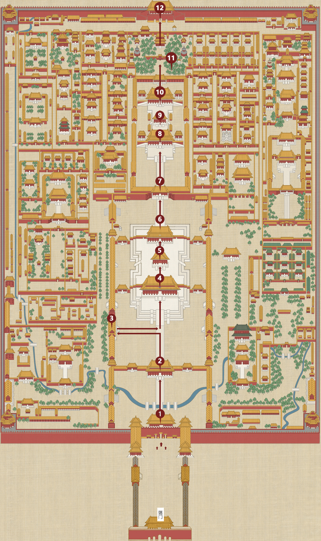 1. Meridian Gate (Wu men) 2. Gate of Supreme Harmony (Taihe men) 3. Belvedere of Spreading Righteousness (Hongyi ge) 4. Hall of Supreme Harmony (Taihe dian) 5. Hall of Middle Harmony (Zhonghe dian) 6. Hall of Preserving Harmony (Baohe dian) 7. Gate of Heavenly Purity (Qianqing men) 8. Palace of Heavenly Purity (Qianqing gong) 9. Hall of Union (Jiaotai dian) 10. Palace of Earthly Tranquility (Kunning gong) 11. Imperial Garden (Yuhuayuan) 12. Gate of Divine Prowess (Shenwu men)