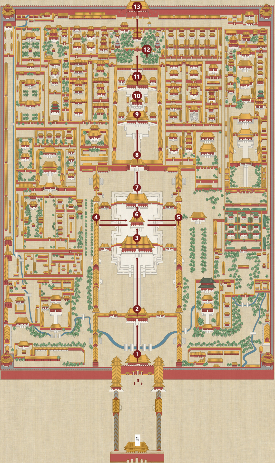 1. Meridian Gate (Wu men) 2. Gate of Supreme Harmony (Taihe men) 3. Hall of Supreme Harmony (Taihe dian) 4. West Wing of Hall of Preserving Harmony (Baohe dian) 5. East Wing of Hall of Preserving Harmony (Baohe dian) 6. Hall of Middle Harmony (Zhonghe dian) 7. Hall of Preserving Harmony (Baohe dian) 8. Gate of Heavenly Purity (Qianqing men) 9. Palace of Heavenly Purity (Qianqing gong) 10. Hall of Union (Jiaotai dian) 11. Palace of Earthly Tranquility (Kunning gong) 12. Imperial Garden (Yuhuayuan) 13. Gate of Divine Prowess (Shenwu men)