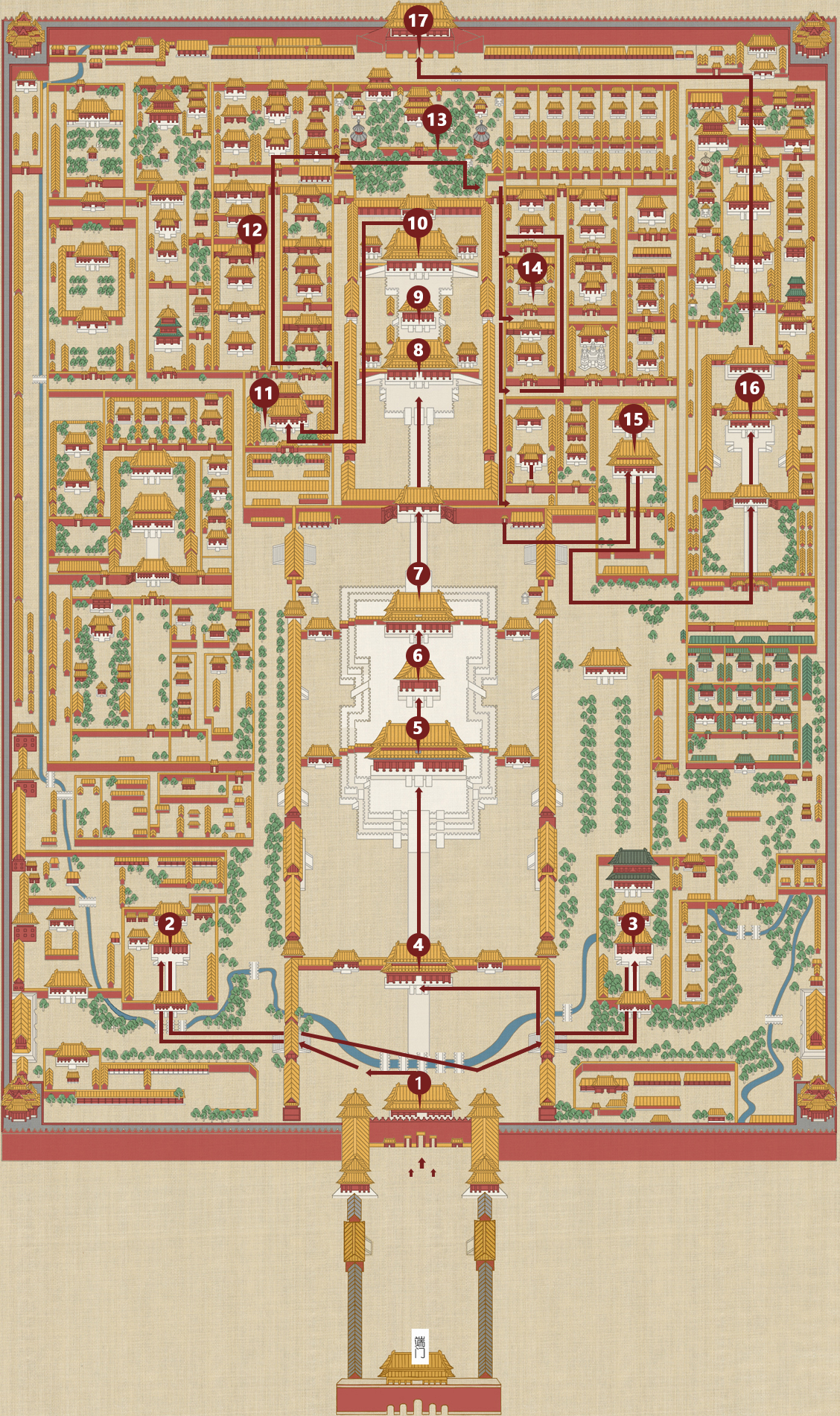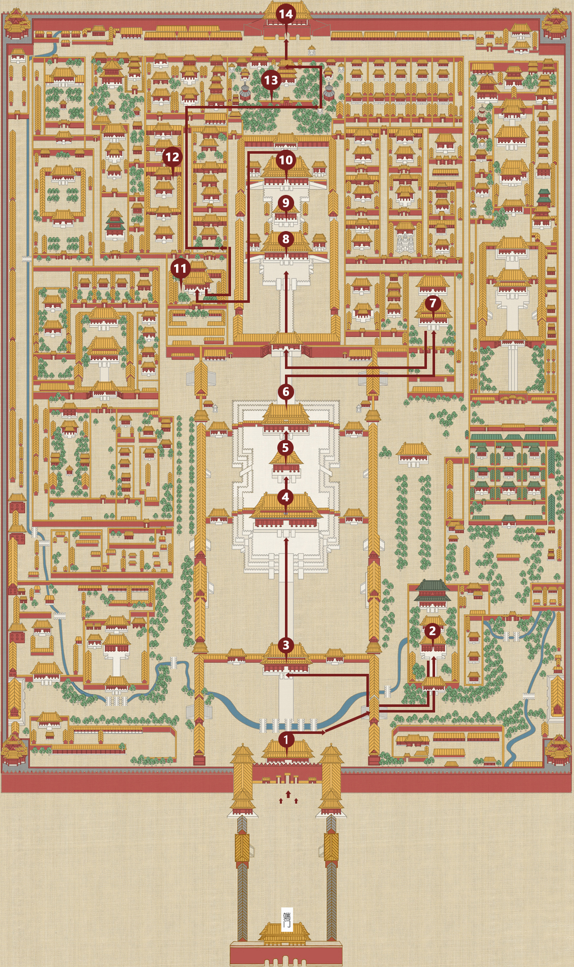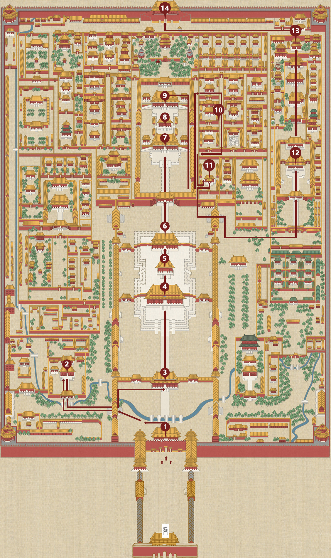 1. Meridian Gate (Wu men) 2. Hall of Martial Valor (Wuying dian) 3. Gate of Supreme Harmony (Taihe men) 4. Hall of Supreme Harmony (Taihe dian) 5. Hall of Middle Harmony (Zhonghe dian) 6. Hall of Preserving Harmony (Baohe dian) 7. Palace of Heavenly Purity (Qianqing gong) 8. Hall of Union (Jiaotai dian) 9. Palace of Earthly Tranquility (Kunning gong) 10. Eastern Six Palaces 11. Hall for Abstinence (Zhai gong) 12. Front Halls of the Palace of Tranquil Longevity 13. Rear Halls of the Palace of Tranquil Longevity 14. Gate of Divine Prowess (Shenwu men)