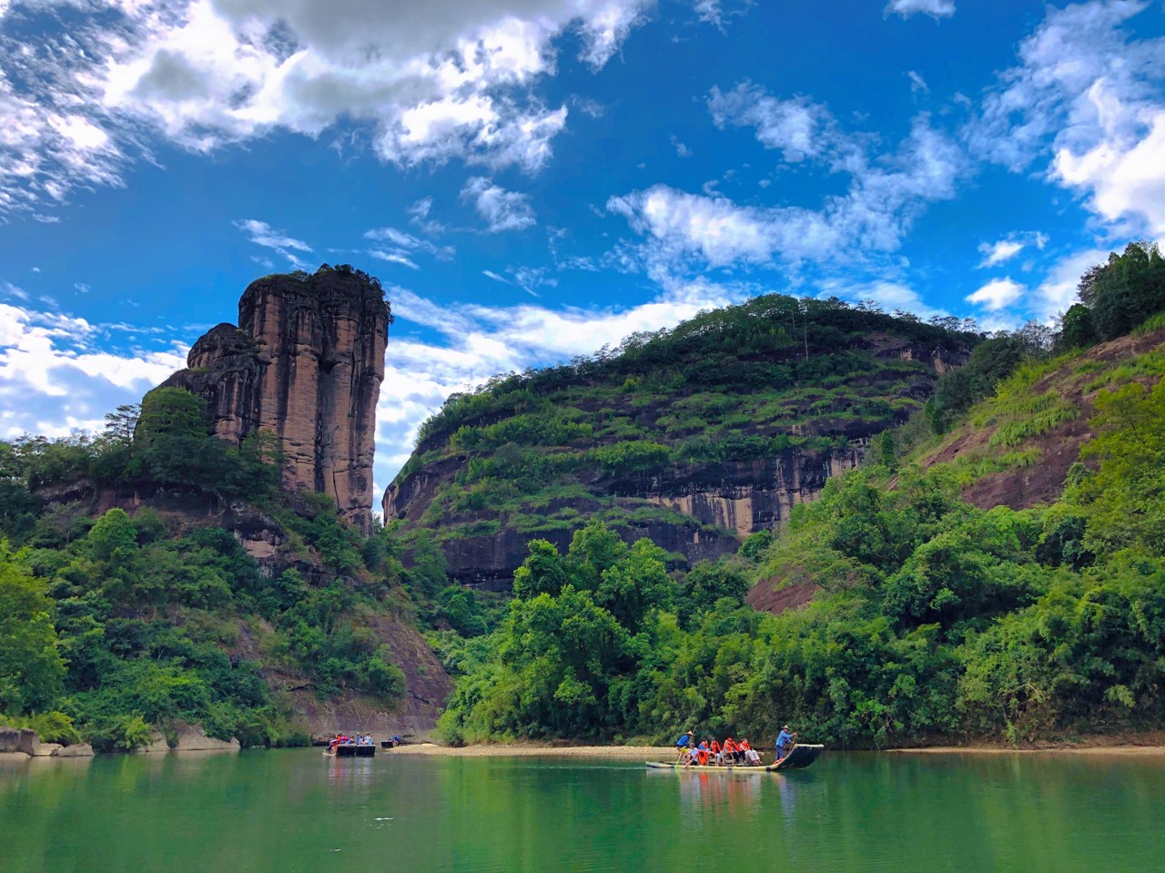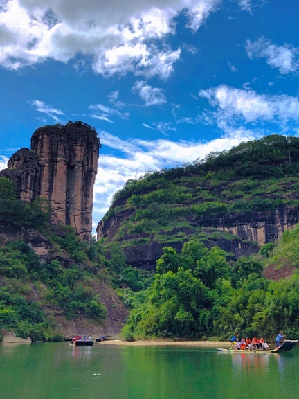 An essential Wuyi experience. Glide downstream on a traditional bamboo raft and witness the stunning Danxia scenery—"one stream threading through endless mountains."