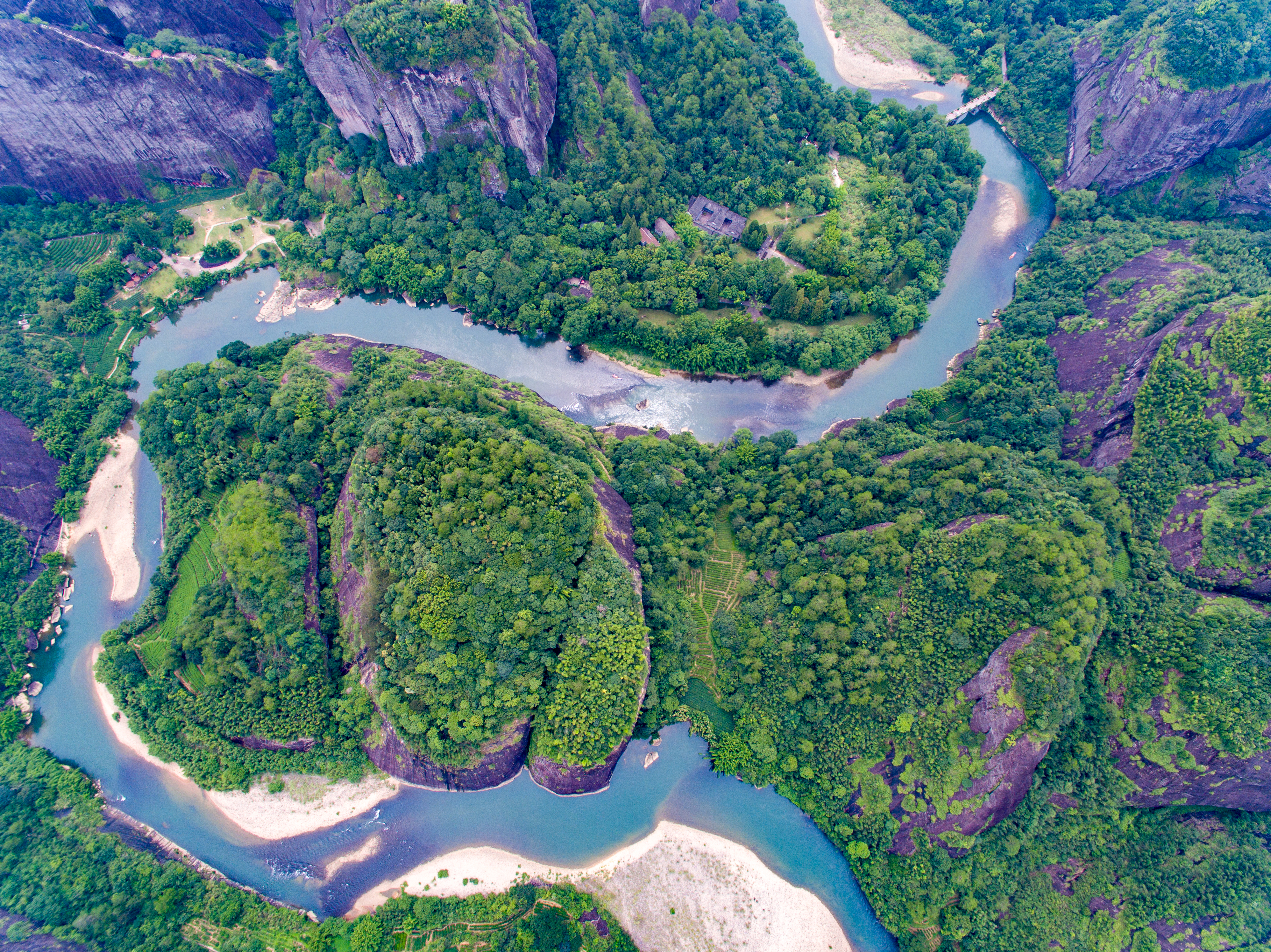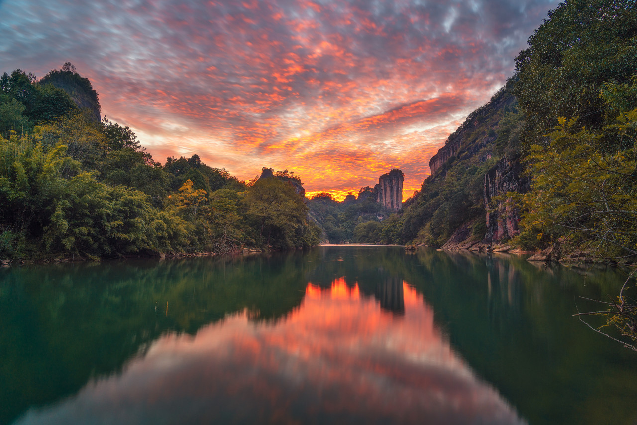 Mount Wuyi in Fujian province is celebrated for its striking Danxia landforms—a breathtaking scene of emerald waters and crimson peaks. The Nine-Bend River meanders like a jade ribbon through the rugged mountains, its waters shimmering with crystalline clarity. In December 1999, UNESCO designated Mount Wuyi a World Cultural and Natural Heritage site in recognition of its unique geological and ecological significance.