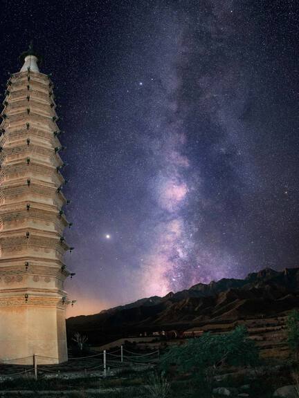 Nestled at the foot of the Helan Mountains, the Twin Pagodas of Baisikou rise beneath a shimmering sky, where thousand-year-old towers and the Milky Way meet in one breathtaking frame. Photo by Zhao Xuejun