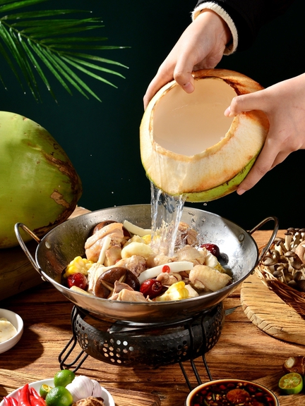 Hainan coconut chicken hotpot is a signature hotpot dish made with Wenchang chicken from Hainan and fresh coconuts. Freshly opened coconut water is used as the soup base and combined with coconut flesh. Once brought to a boil, tender chicken pieces are swished in the broth, creating a light, naturally sweet, and aromatic flavor.