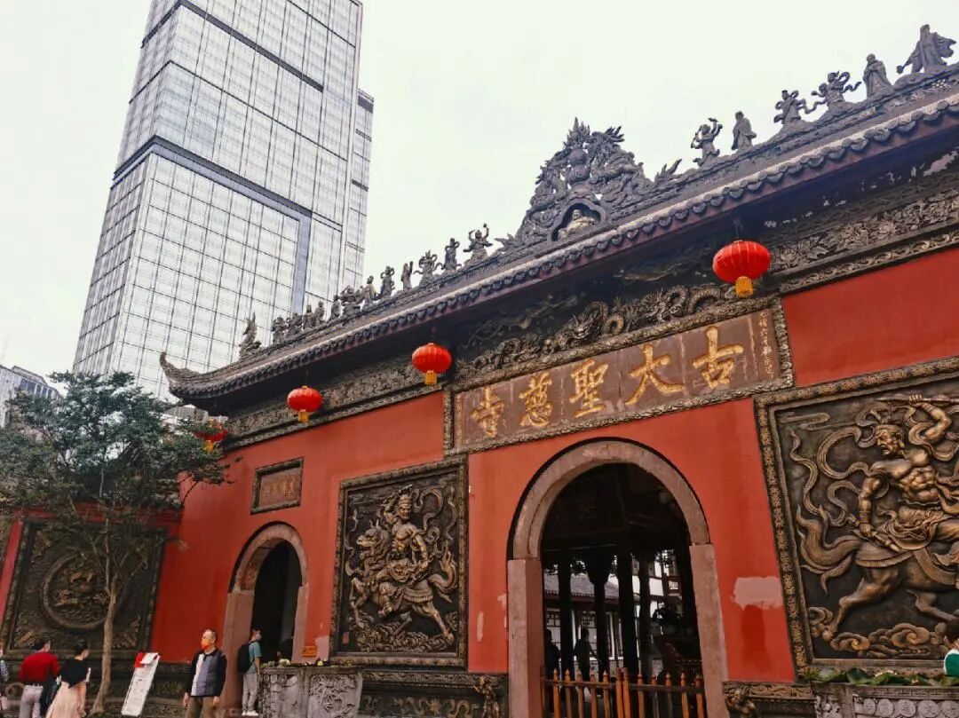 The striking vermilion walls of the thousand-year-old Daci Temple offer a compelling contrast against the backdrop of modern architecture.