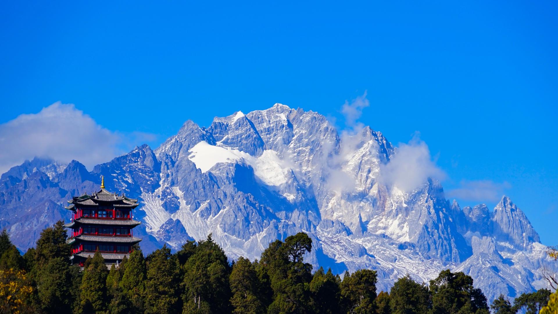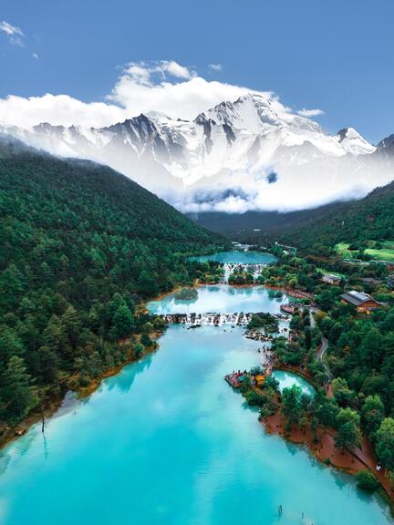 Located northwest of Lijiang city, Yunnan province, Yulong (Jade Dragon) Snow Mountain offers a wide variety of natural landscapes—snow‑capped peaks, wetlands, meadows, forests, and lakes. Within the scenic area are several noteworthy attractions: Glacier Park (noted as the glacier park at the lowest latitude in Asia), the romantic Spruce Meadow, the natural grazing grounds of Yak Meadow, and the sapphire-blue Blue Moon Valley. The area also includes cultural sites and visitor experiences such as the Glacial Geology Museum and the large-scale outdoor performance Impression Lijiang, staged in an authentic natural setting.