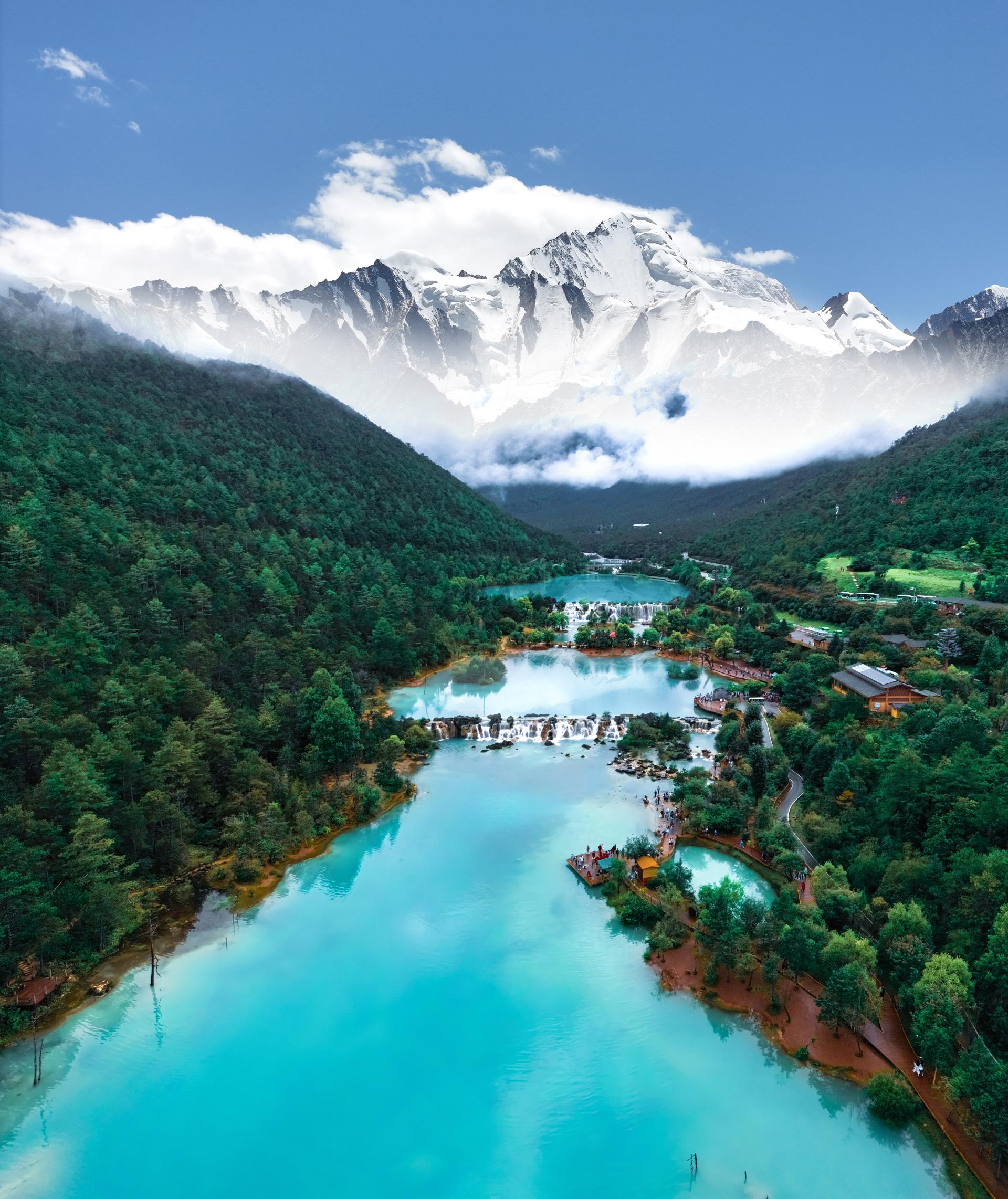 The lake displays a crystal-clear blue hue caused by mineral deposits. On sunny days, the snow-capped peaks reflect on the water to create a mesmerizing scene. Visitors can take the scenic bus to the "Shuiyue Pavilion" stop and explore on foot or by renting an electric cart; the complete tour takes about an hour.