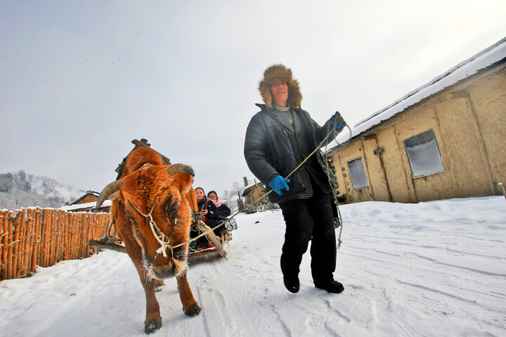 Tourists can ride an ox-drawn sled at Jinjiang Wooden Cabin Village