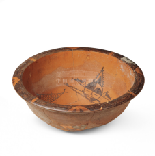 This painted basin is red in color. An intermittent black band is painted along the rim, while two symmetrical groups of human faces and fish motifs are rendered in black pigment on the inner wall. The human faces are round, with pointed shapes resembling hair buns on the crown of the head, as well as fish-fin-like ornaments. The entire composition is highly dynamic, with concise designs imbued with a sense of fantasy.