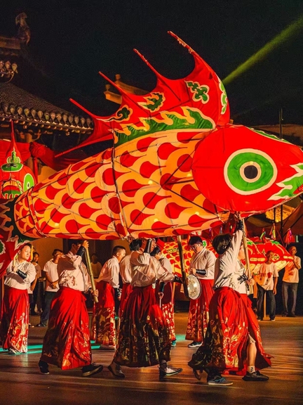 Fish lanterns are traditional Chinese folk dance props. Their frames are usually crafted from bamboo strips, covered with cotton paper or white cloth painted with fish-scale patterns, and fitted with candles or LED lights inside. They consist of three parts: head, body, and tail, which can rotate. Common forms include carp and mandarin fish. During performances, they move in routines such as "carp swinging its tail" and "fish leaping over the dragon gate." The name is a homophone for "yú" (meaning "surplus" in Mandarin), symbolizing abundance and good fortune. Fish lanterns are widely used in festive parades and ceremonial celebrations, with formations such as square arrays and Bagua arrays. The fish lantern tradition can be traced back to the Southern Song Dynasty, with branches such as the Zhanqi fish lantern, the Wangmantian fish lantern, and the Yuliang fish lantern still kept alive in Huangshan, Anhui.