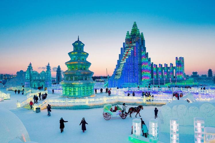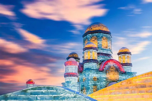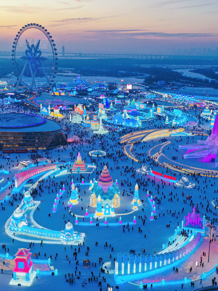 Artisans harvest ice from the Songhua River to construct towering ice castles, towers, and slides reaching dozens of meters high. As dusk falls, tens of thousands of LED lights illuminate the structures, transforming the entire city of ice into a fantastical winter kingdom.