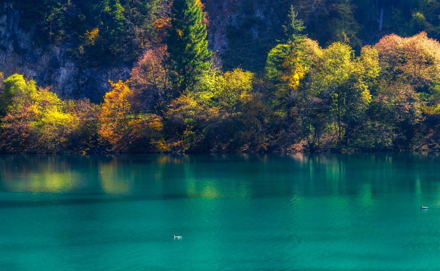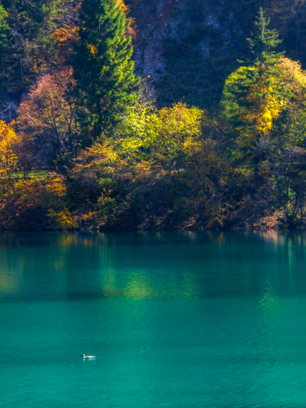 Jiuzhaigou’s lakes contain large quantities of Travertine granules, which strongly reflect and scatter shorter wavelengths of light, especially blue and green. Lake depth and the exceptional clarity of the water also contribute to its stunning colors.