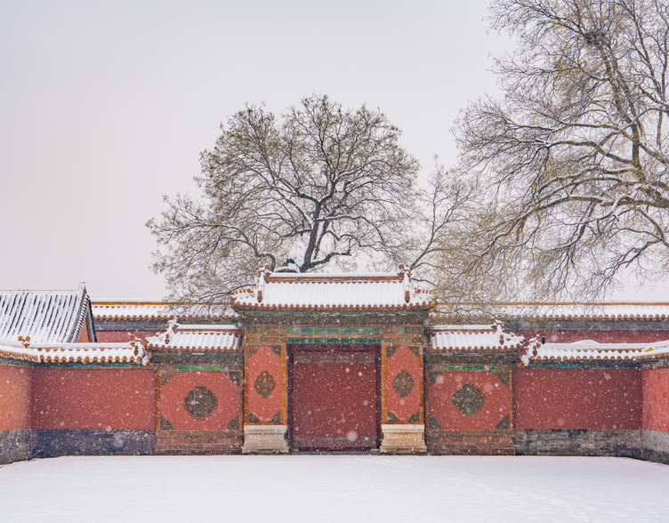 The majestic architecture of the Forbidden City is blanketed in snow.