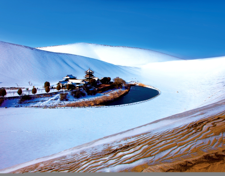 Nestled within the yellow sands, the Mingsha Mountain and Crescent Lake scenic area blends snow and sand, revealing the desolate beauty and gentle charm of the Northwest.